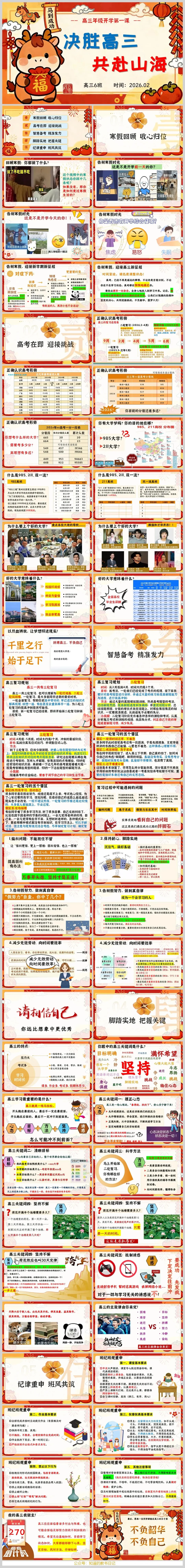 形势分析与目标引领:系统梳理高三三轮复习的时间线与核心任务,并提供了可替换的各省高考数据模板(报名人数、分数线、一分一段表)。更以“985/211高校地图”、“毕业生薪酬榜”等直观素材,点燃学生的大学梦想与奋斗动力!🎯