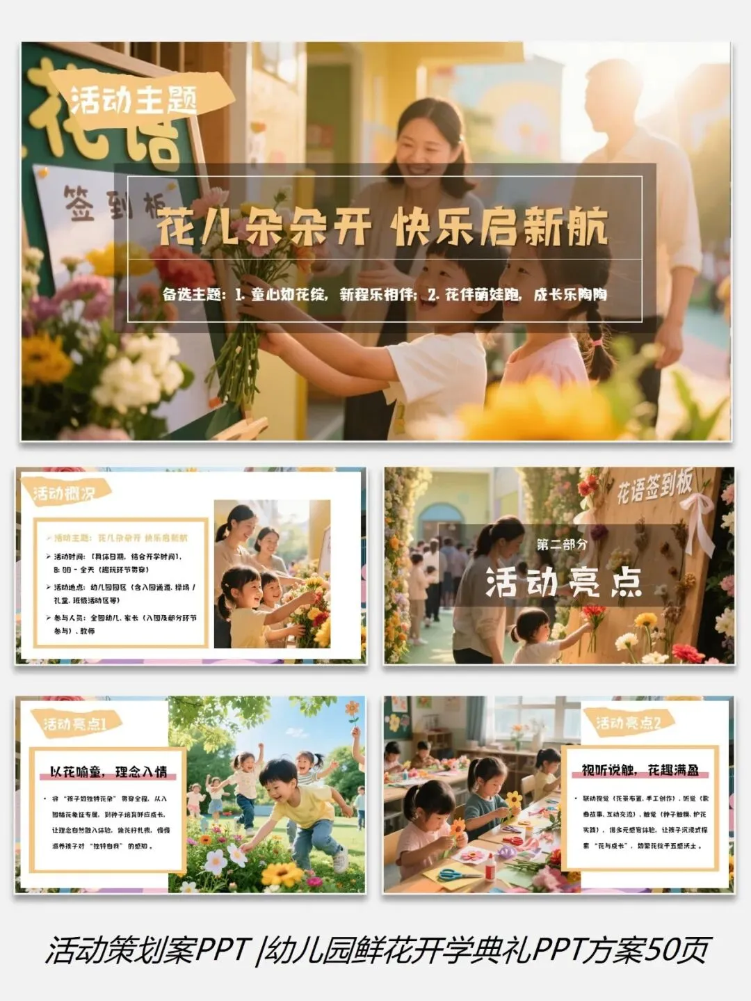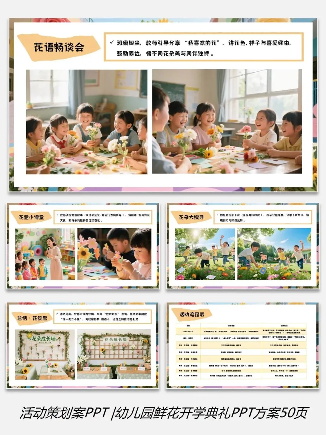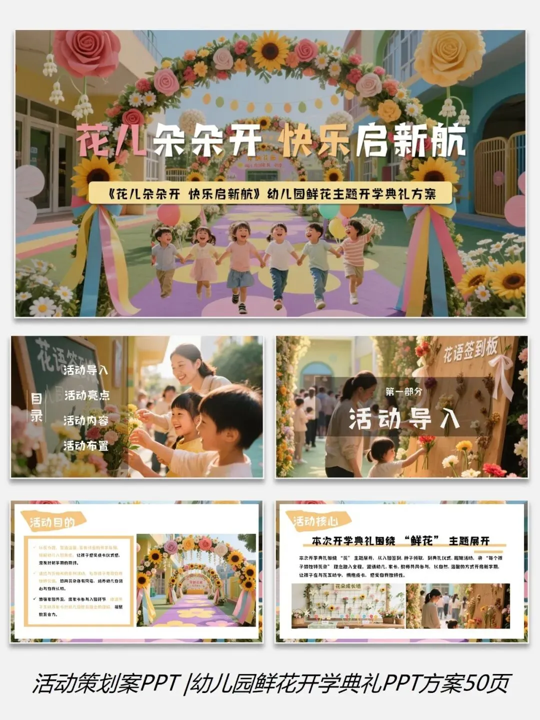 0226-0幼儿园学校鲜花主题开学典礼PPT方案50页(配套5份资料)