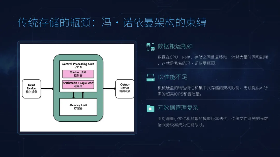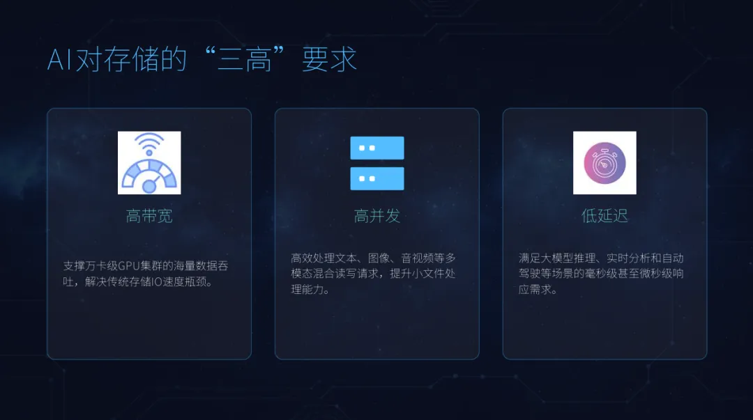传统基于冯·诺依曼架构的存储系统无法满足AI应用对存储的“三高”要求。也即,高带宽、高并发和低延迟。