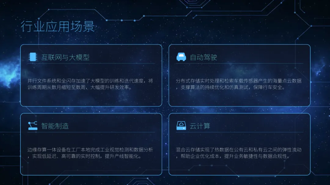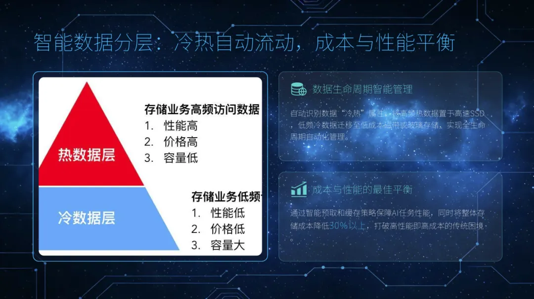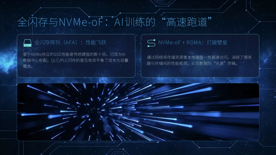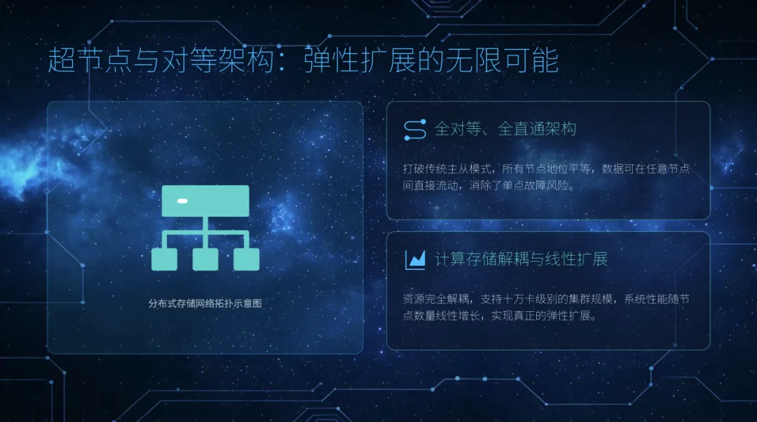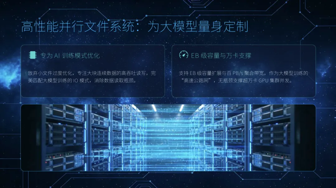 高性能并行文件系统: 专为大模型训练的大块连续IO模式优化,支持EB级容量和百PB/s级聚合带宽,支撑超万卡GPU集群。