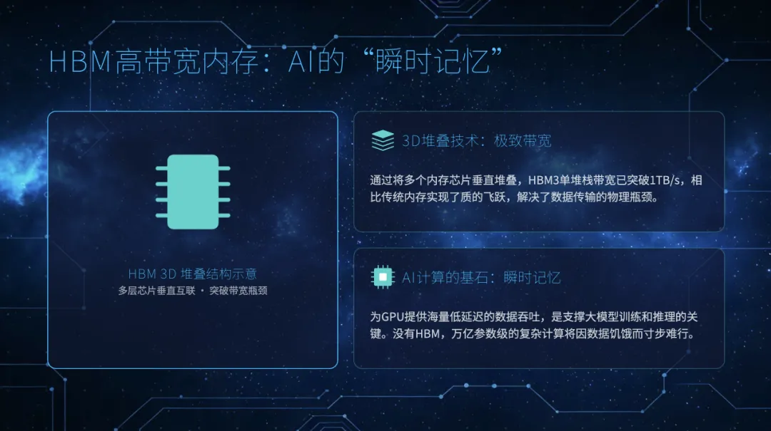 采用3D堆叠技术,提供TB/s级极致带宽,作为GPU的“瞬时记忆”,是大模型训练的关键基石。