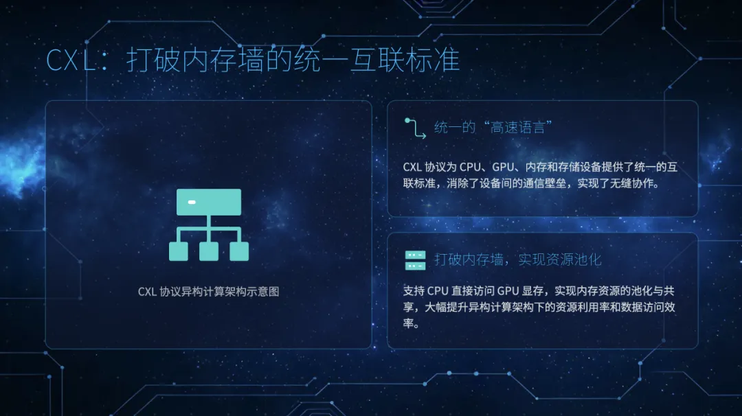 CXL协议: 为CPU、GPU、内存、存储提供统一互联标准,打破“内存墙”,实现内存资源池化与高效共享。