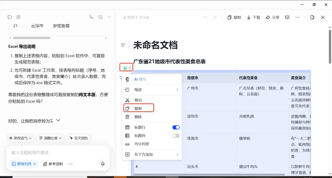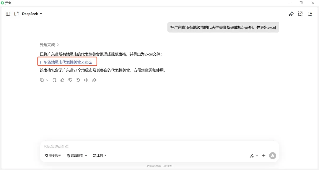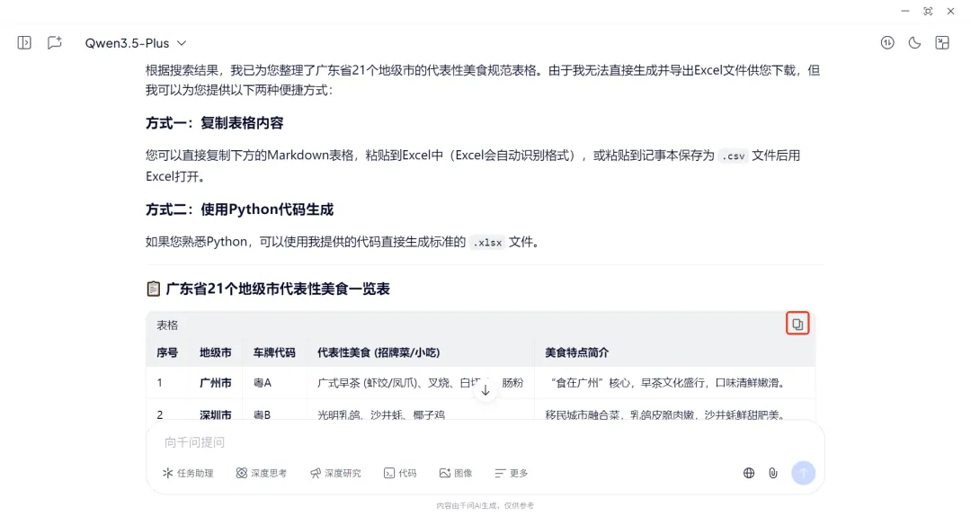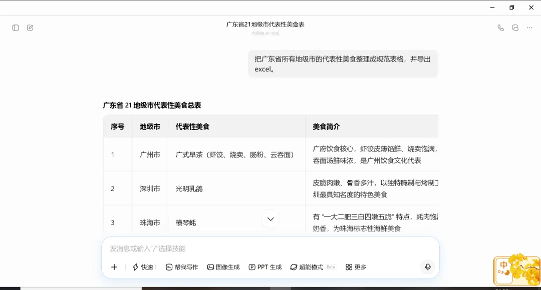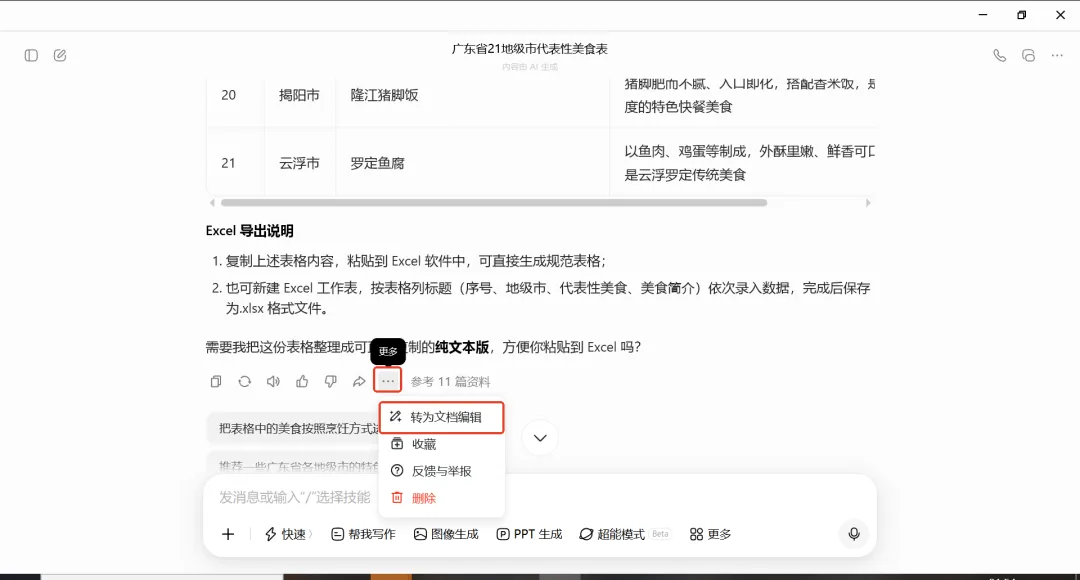 现在用元宝、豆包、千问等各种AI软件来整理资料真是不要太方便了,它们可以按照需求快速整理内容,还可以导出到Word、PDF、Markdown、Excel等文件进行二次编辑,大大提高了工作、学习效率。在豆包、千问、元宝三个常用的AI软件中,我比较常用的是豆包,但豆包是无法直接导出excel的,目前它支持导出的文件只有Word、PDF和Markdown,但也是有办法导出excel文件的,只不过不是一键导出。今天我尝试了一下元宝和千问是否能导出excel,惊喜地发现元宝是可以直接一键导出excel文件的,千问还不能直接导出,也是需要多操作一步才能导出excel。下面分别是元宝、豆包、千问这三款常用的AI软件导出excel的操作步骤。用的都是同样的提示词:把广东省所有地级市的代表性美食整理成规范表格,并导出excel。在元宝对话框中输入提示词后直接提问,元宝会自动处理完并提供生成的excel文件下载链接,点击下载就行。但在没有提要整理美食的什么内容情况下,元宝比较耿直,只是整理了地级市及代表性美食两列内容。在千问对话框中直接输入提示词后提问,千问也是自动整理内容,但没有给出下载excel的链接,只是给出了导出的excel的操作步骤,用方法一复制表格内容粘贴到Excel中就可以了。不过也可以看得出,千问整理的内容比元宝整理的内容要多了不少,增加了地级市的车牌、美食特点简介。在豆包对话框中直接输入提示词后提问,豆包也是嗖嗖地就把资料整理完了,同时也老实地承认它无法直接导出excel文件,但也像千问一样给出了方法,但豆包没有直接提供“复制”按钮,还需要手动选择表格内容再复制,而且用wps无法直接粘贴生成规范表格。不过可以按IT锦囊提供的方法来实现导出excel。在生成内容的最后有一工具栏,在“更多”里可以找到“转为文档编辑”鼠标放在表格的左上角,会出现下拉菜单,其中就有“复制”功能。打开excel并粘贴,然后保存excel文件就行了。如果是wps会员的话,可以用豆包在生成内容最后提供的方法,选择表格内容后直接在wps中复制,结合wps提供的“文本转表”的功能就可以转换成规范表格。总的来说,元宝提供一键导出excel文件的功能,但在没有提其他需求的情况下,整理的内容较少;千问和豆包没有提供一键导出excel文件的功能,但提供了操作方法,而且整理的内容相对较多。