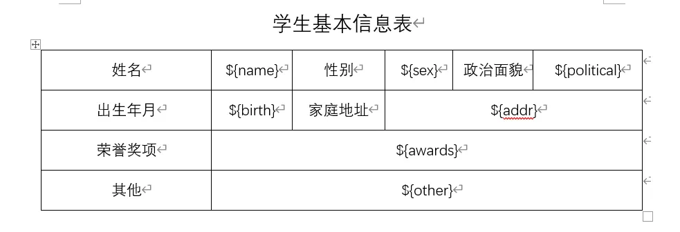 先给大家看一下我这次实现的核心场景,首先是一份提前设计好的《学生基本信息表》Word 模板:
