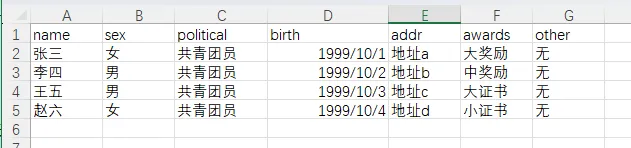 然后是对应的 Excel 数据源,每一行就是一个学生的完整信息,列名和 Word 模板里的占位符一一对应。