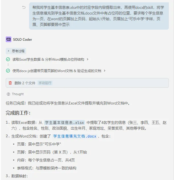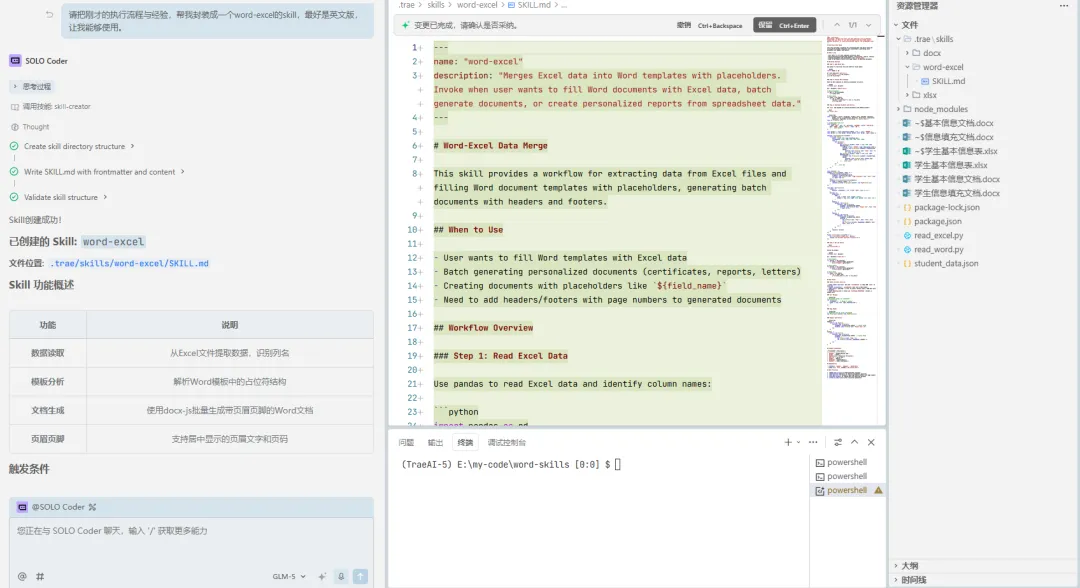 昨天借助AI实现Excel填充Word模板失败了,一次失败的AI使用经历,本着不放弃的精神,今天下班使用Trae CN换成模型GLM-5继续尝试并成功,把 Excel 数据一键填充到 Word 模板里,批量生成 N 页的规范表格。我把提示词和我的执行流程分享出来,最后把整个流程封装成了一个直接用的 skill,完全不用写复杂代码。
