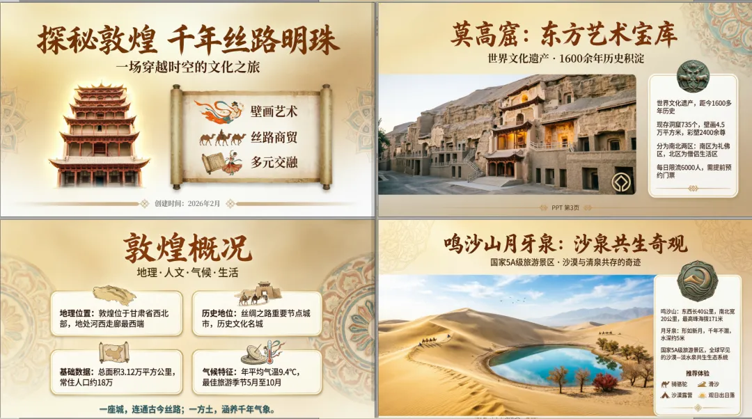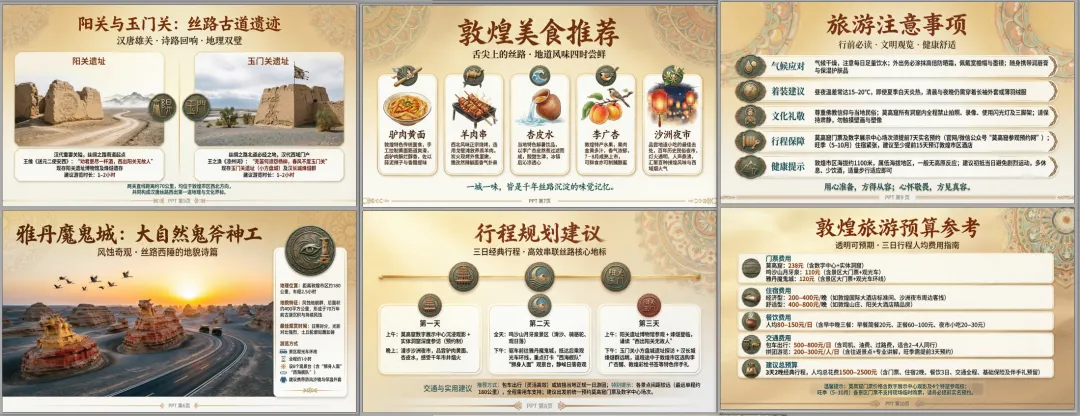 我把PPT图片截图出来给大家看下,是不是很赞,敦煌莫高窟的九层塔,背景配图的莫高窟壁画藻井花纹,雅丹地貌都很不错,整体PPT构图精美,关键中文字真的很稳,没有看出来有啥瑕疵。