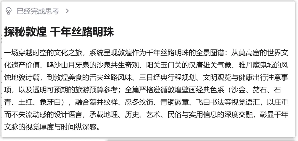 我们来看一个例子,我一句话提示词:“请生成一个介绍去敦煌旅游的PPT”。