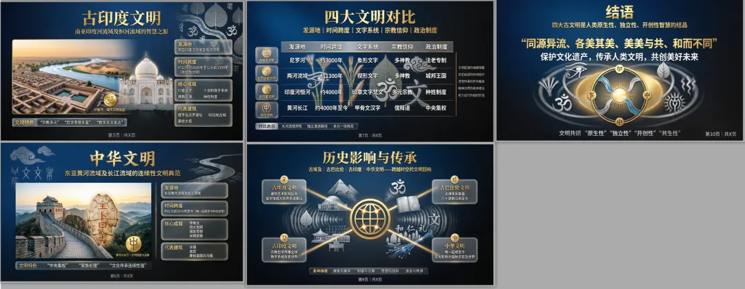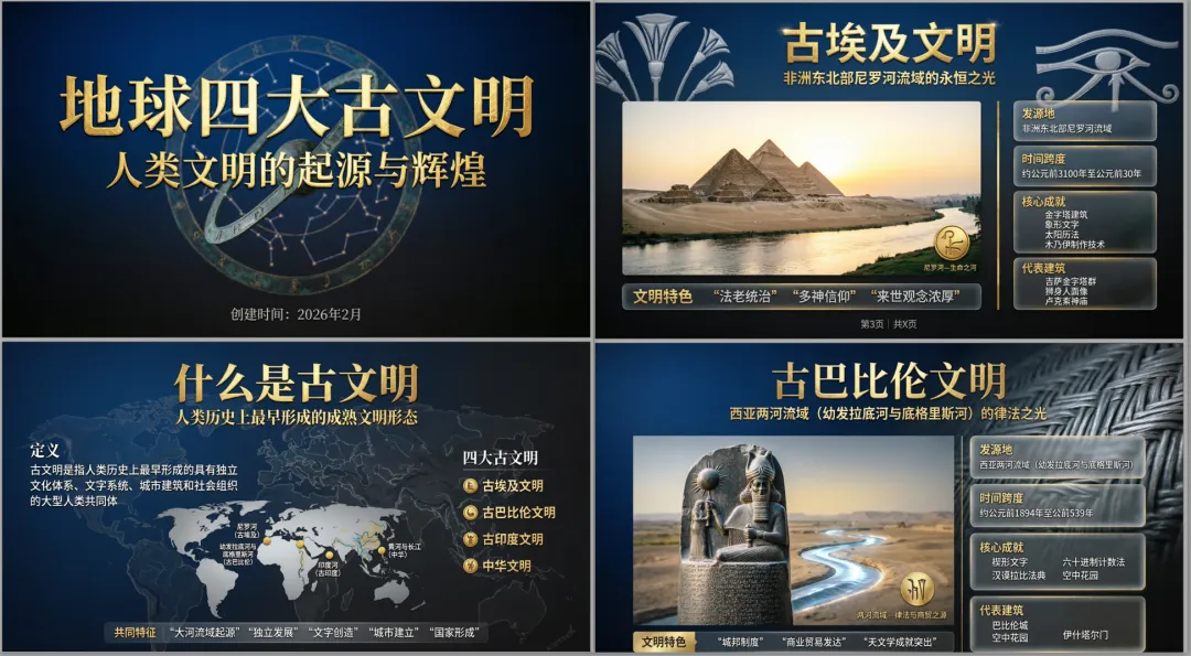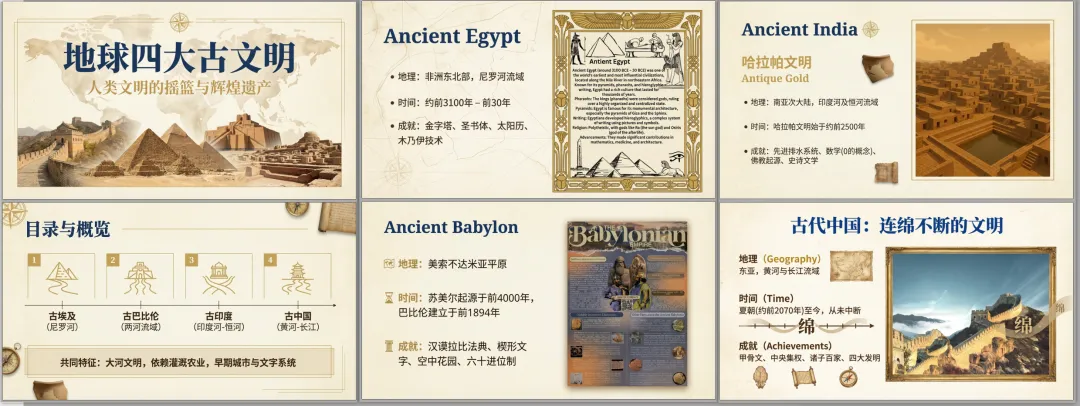 再试个之前在Lovart用过的案例提示词:“请设计一份PPT,介绍地球四大古文明,要求图文并茂。”