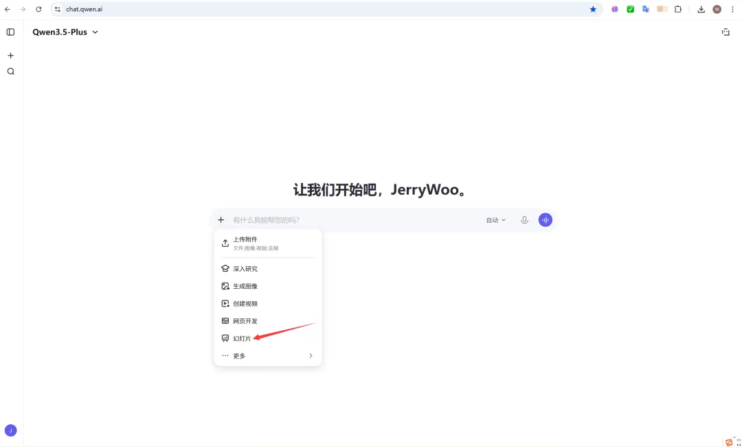 模型记得选Qwen3.5-Plus,然后点击中间输入框的“+”号,选中”幻灯片“,开始你的PPT一键生成之旅吧。