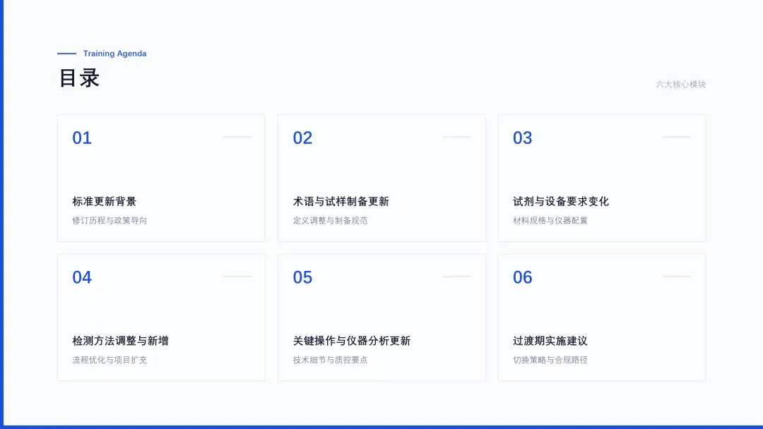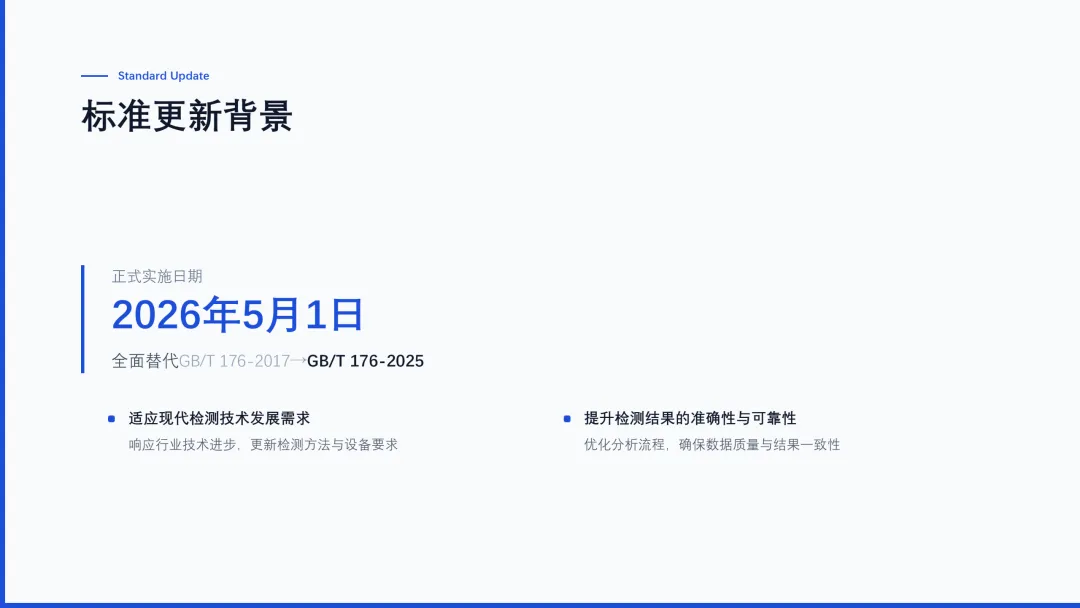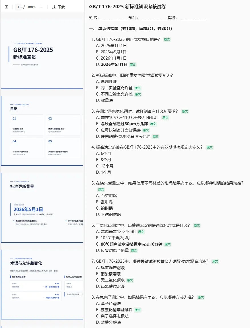 你现在是一位检测公司的技术负责人。GB/T 176-2025《水泥化学分析方法》新标准将于2026年5月1日正式实施,请基于知识库中的资料,写一份“GB/T 176-2025《水泥化学分析方法》新标准宣贯培训”的PPT大纲并生成。 用于公司内部培训。
