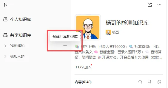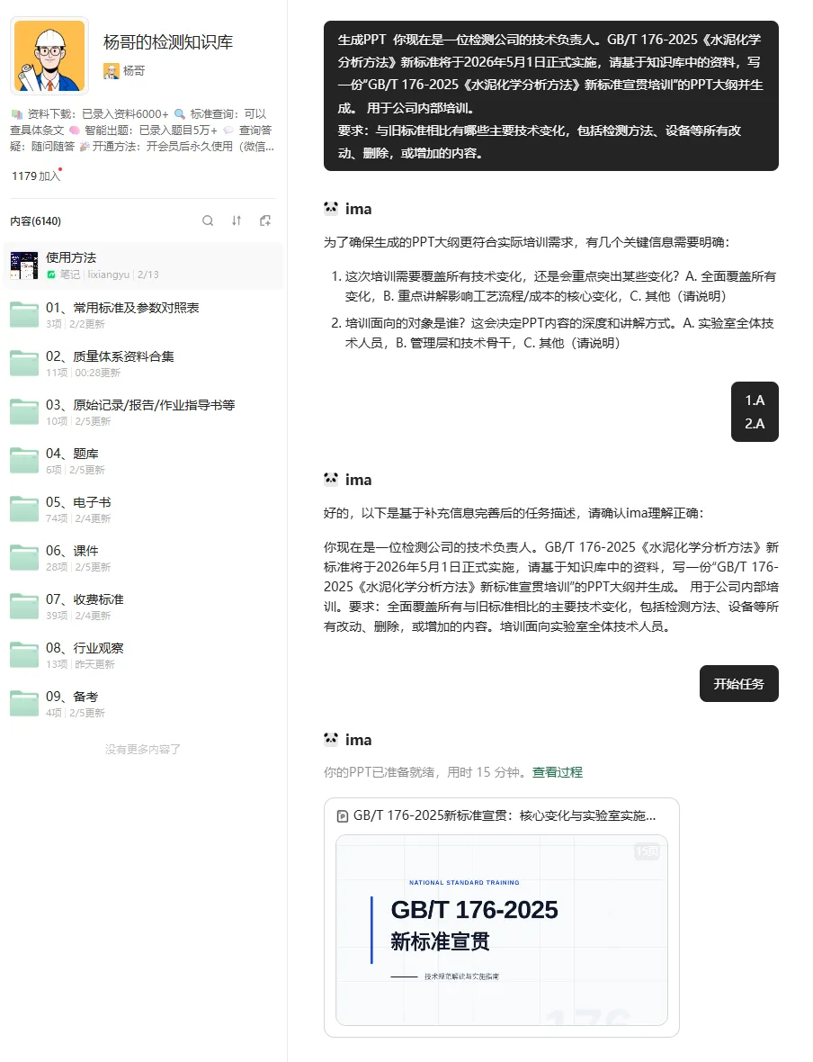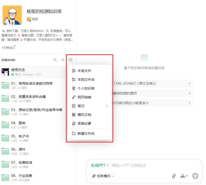 以上三步是搭建知识库,准备阶段,如果之前用过ima可以略过。如果嫌麻烦,或者缺少资料,可以加入我的知识库,然后直接使用,里面已有6000多份检测资料。
