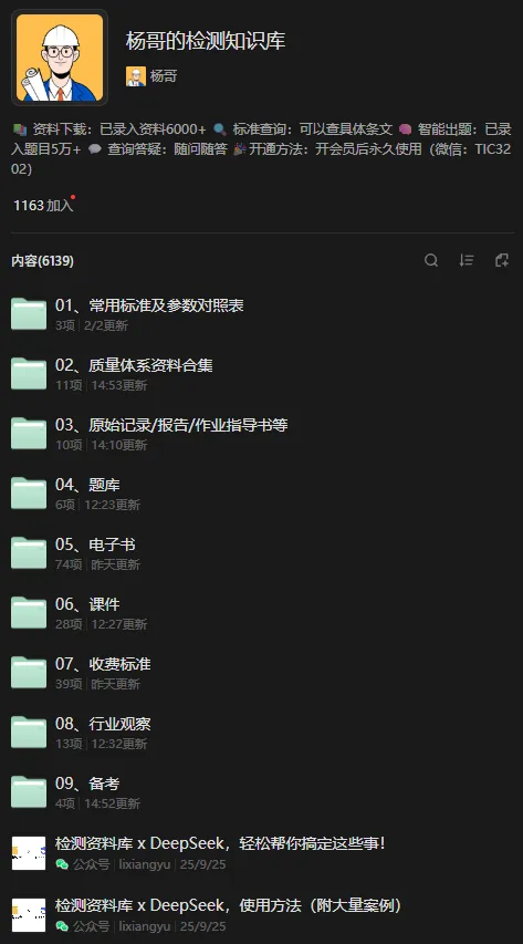 如果有疑问,可以加入这个检测AI交流群,群内会解答相关问题。前面提到我建的检测知识库,里面有6000多份资料,如何加入这个知识库?点击下面小程序在线购买会员,然后点击页面上的「检测知识库」申请加入,审核通过后即可使用。检测知识库加入后不限期,只要不退出,就可以一直使用,里面的资料也会保持更新。随着知识库内容的增加,价格也会上调,早加入早优惠早使用。