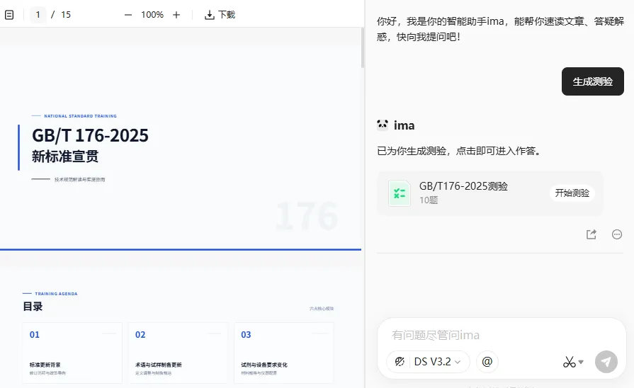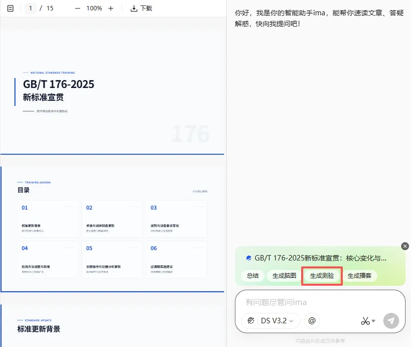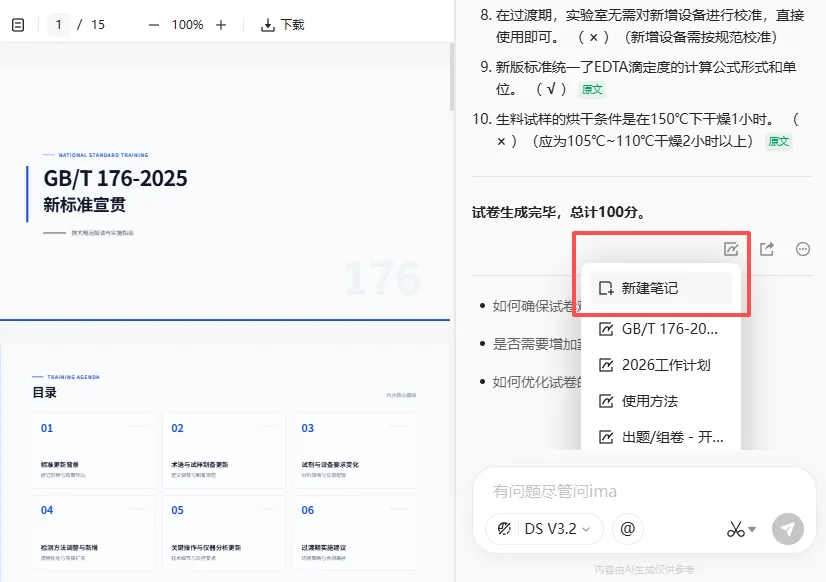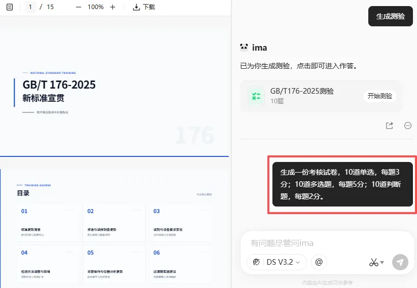 在ima中打开刚才生成好的PPT,点击右上角“问问ima”方法类似步骤五,也是在ima中打开PPT后,右上角点击“问问ima”,在对话框输入指令:生成一份考核试卷,10道单选,每题3分;10道多选题,每题5分;10道判断题,每题2分。