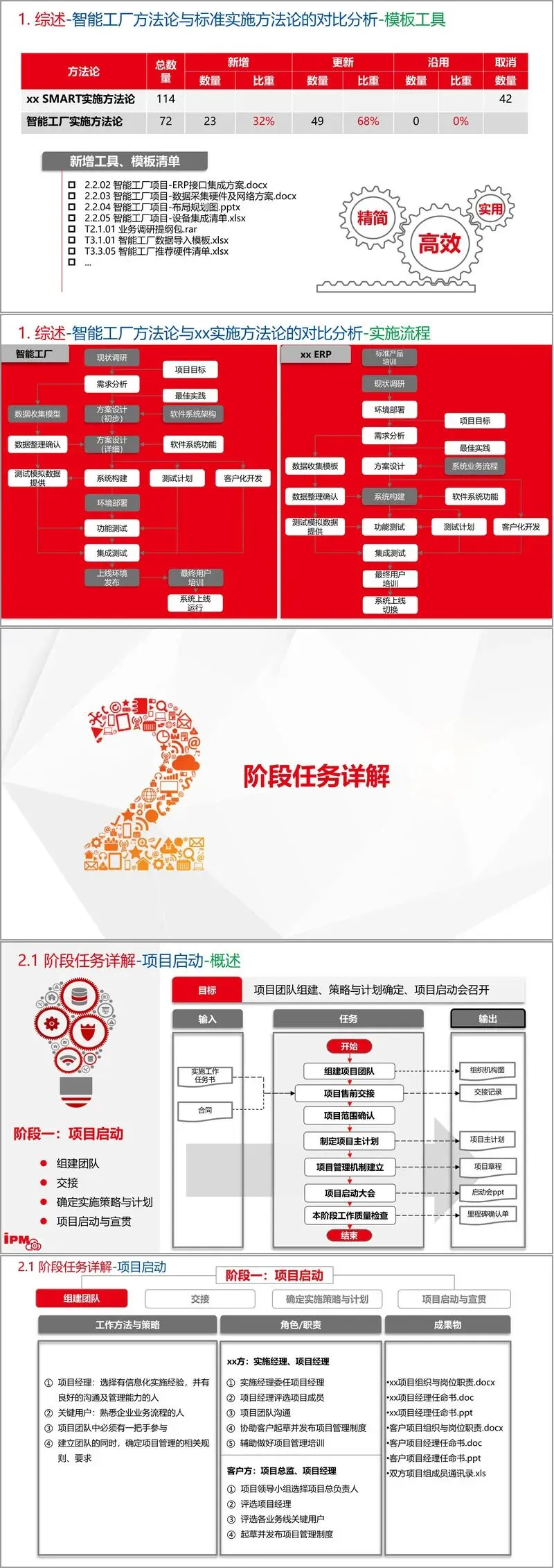 该方法论的核心定位在于弥补传统实施方法在智能工厂场景下的不足。IPM在原有标准实施方法论基础上,补充了智能工厂特有的实施策略、专用工具和模板,强化了对时间、质量、资源三大要素的精细化控制。其适用范围明确指向三类客户需求:聚焦生产制造过程管理、关注数据智能采集与作业效率提升,以及需求模糊需逐步细化的项目。相较于xx SMART实施方法论V2.5的114个模板工具,IPM精简至72个,其中新增模板占比32%,更新模板达68%,凸显其针对性和创新性。新增的《ERP接口集成方案》《数据采集硬件及网络方案》《布局规划图》等工具,直指智能工厂实施中的关键难点。