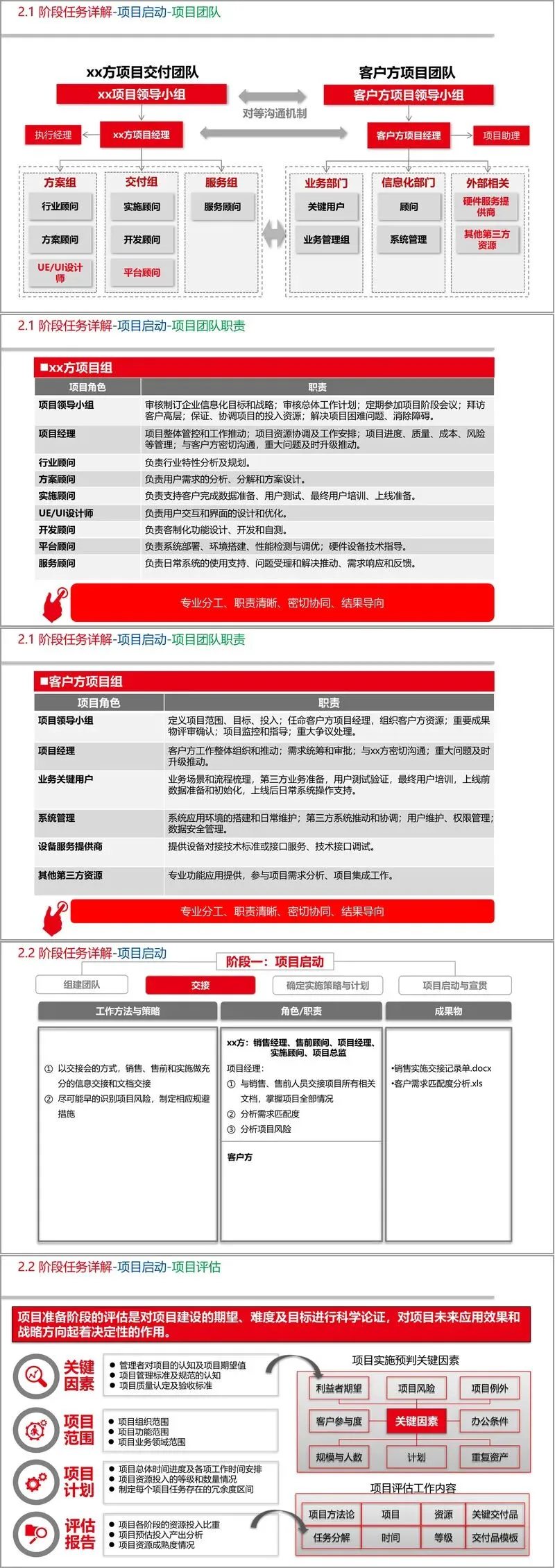 实施框架采用五阶段递进结构。阶段一“项目启动”重在夯实地基,通过组建跨职能团队(要求信息化经验丰富的项目经理、熟悉业务流程的关键用户及高层参与)、完成销售实施交接、精准评估项目范围与风险,并借力项目启动会统一共识。其中,团队构建强调专业分工,xx方团队需涵盖行业顾问、方案顾问、开发顾问、平台顾问等角色,客户方则需明确业务关键用户、系统管理员及设备服务商职责,形成“专业分工、职责清晰、密切协同”的运作机制。