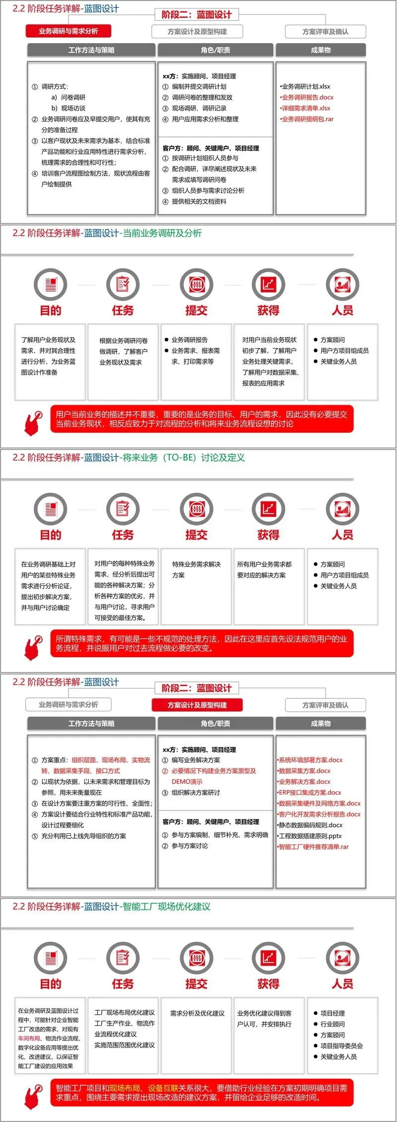阶段二“蓝图设计”是方案定调的枢纽。该阶段通过问卷调研、现场访谈深度梳理业务现状,结合标准产品功能与行业特性进行需求分析,进而设计系统环境部署、数据采集、ERP集成三大核心方案。特别强调利用Axure RP等原型工具构建演示DEMO,以可视化方式确认需求,减少沟通偏差。方案评审环节须组织领域专家及客户关键用户联合评审,最终签署的《业务解决方案》将作为项目里程碑文件,严格规避“先开发、后确认”的风险。