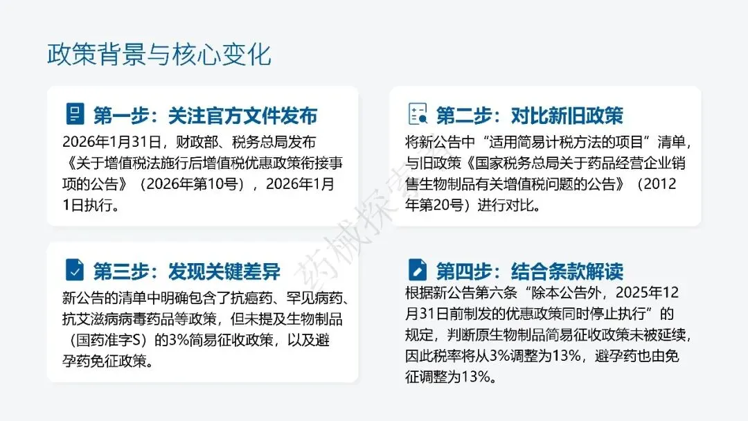 非常感谢杨老师的信任和鼓励,并给了我机会,让我能在直播间和各位同行一起交流 2026 年药品行业增值税政策调整的相关内容。本次分享的核心内容围绕最新发布的增值税优惠政策衔接公告展开(之前也写过这方面的内容生物制品税率不再是3%?),下面我将把直播中分享的 PPT 内容整理成文。2026 年 1 月 1 日起《中华人民共和国增值税法》正式施行,财政部、税务总局同步发布增值税优惠政策衔接公告,药品行业成为本次政策调整的核心受影响领域,尤其是生物制品、避孕药等品类的增值税政策发生重大变化。本次政策调整围绕优惠政策衔接展开,明确了不同药品品类的税率适用标准,也对药品经营企业的合规运营提出了新要求。一、政策背景与核心变化