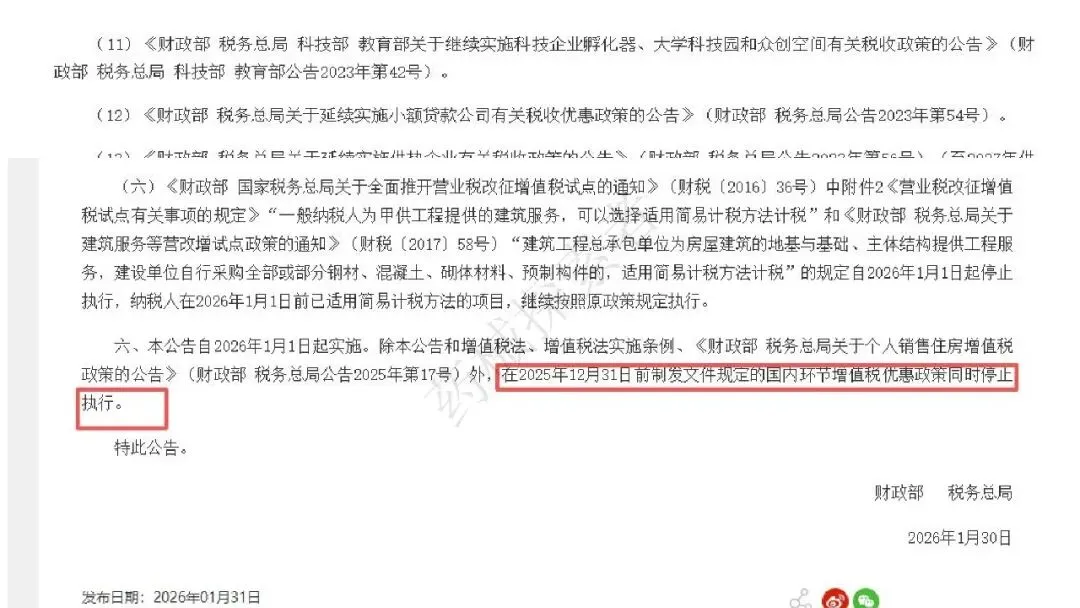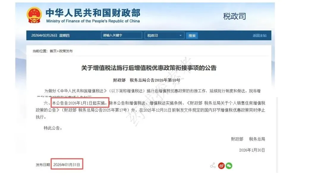 2026 年 1 月 31 日财政部、税务总局发布 2026 年第 10 号公告,作为增值税法施行后的优惠政策衔接文件,自 2026 年 1 月 1 日起执行。
