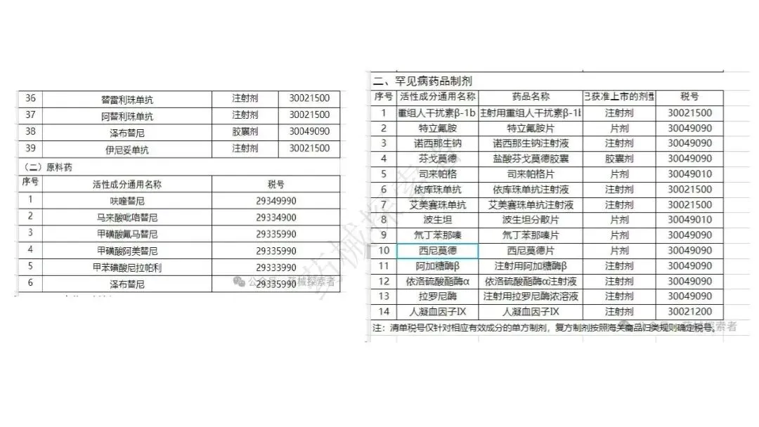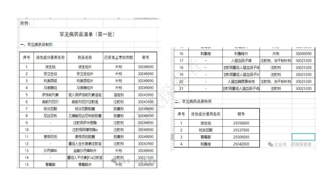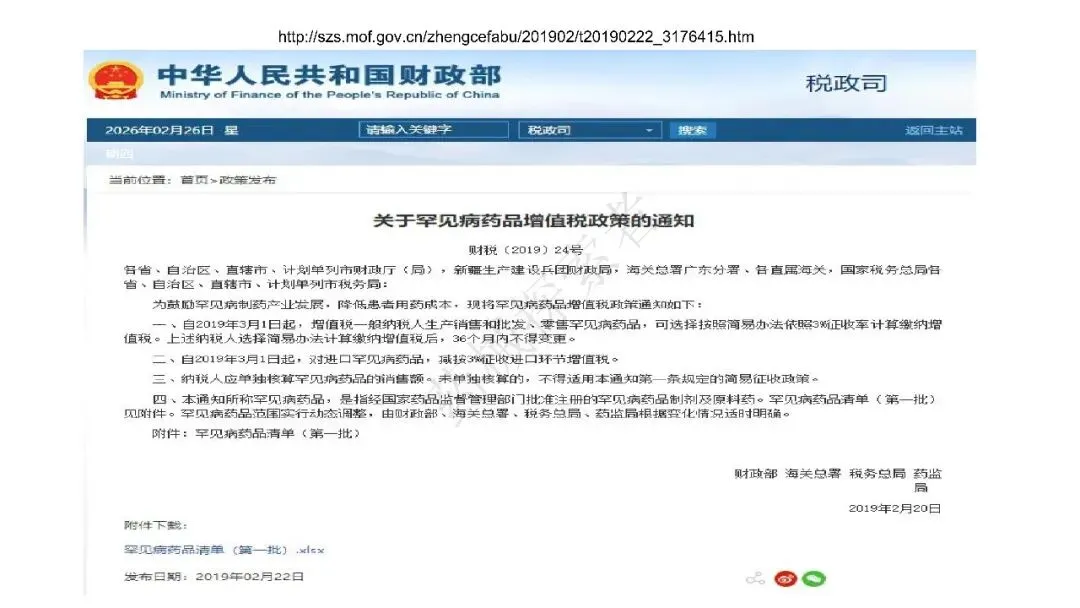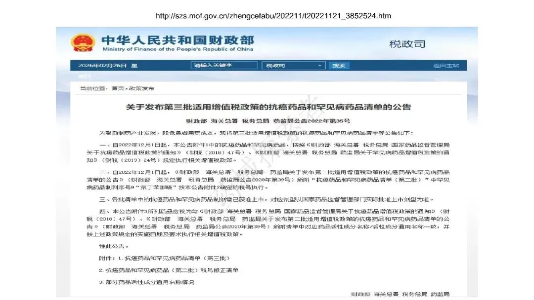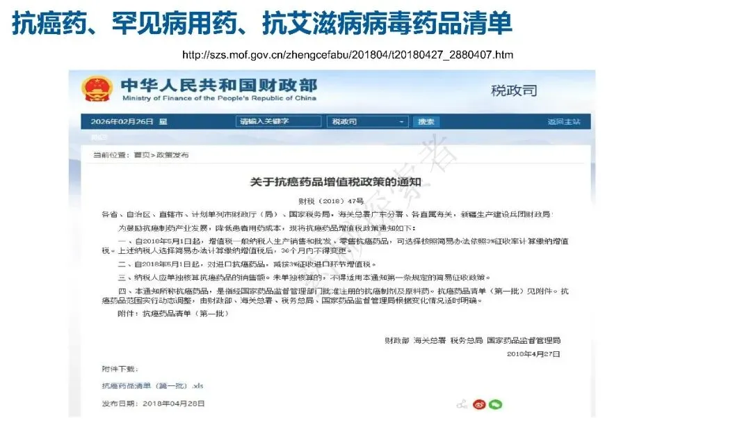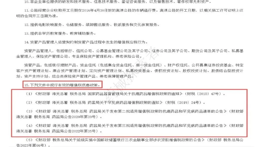 - 罕见病药品:依据 2019 年财税 24 号文、2020 年第 39 号公告、2022 年第 35 号公告,发布多批罕见病药品清单,涵盖波生坦、诺西那生钠、依库珠单抗等制剂及原料药,享受与抗癌药相同的 3% 简易征收政策。