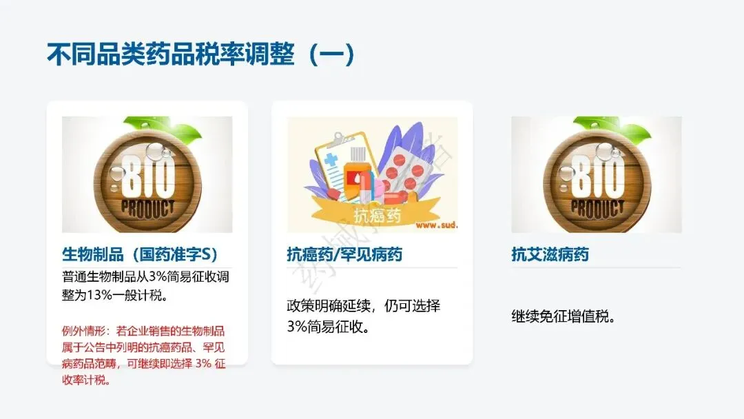 - 1、生物制品(国药准字 S):普通生物制品原 3% 简易征收政策终结,统一调整为 13% 一般计税;仅当生物制品属于抗癌药、罕见病药范畴时,可继续选择 3% 征收率计税。