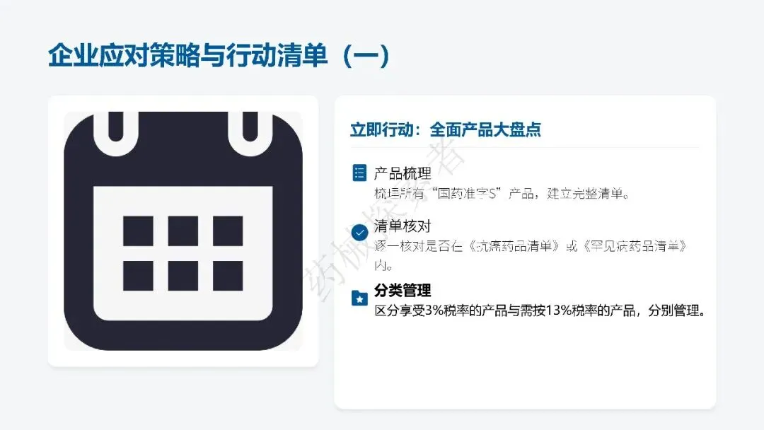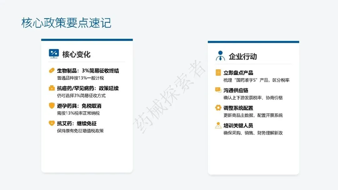 - 1、立即盘点 “国药准字 S” 产品,精准区分不同税率适用品类(仅当生物制品属于抗癌药、罕见病药范畴时,可继续选择 3% 征收率计税,其余的要按13%收率计税),建立分类管理清单;2、主动与供应链上下游沟通,确认发票税率、协商价格调整,降低政策对经营的影响;