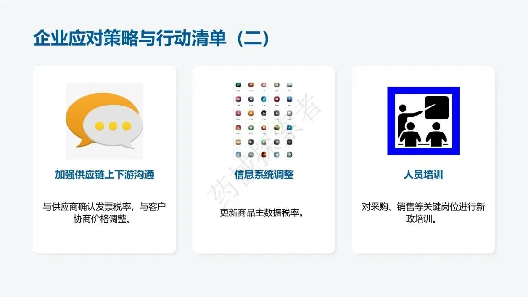 - 3、快速完成商品主数据、开票系统、财务系统的税率调整,确保系统配置合规;4、对采购、销售等关键岗位开展新政培训,夯实税务合规基础。