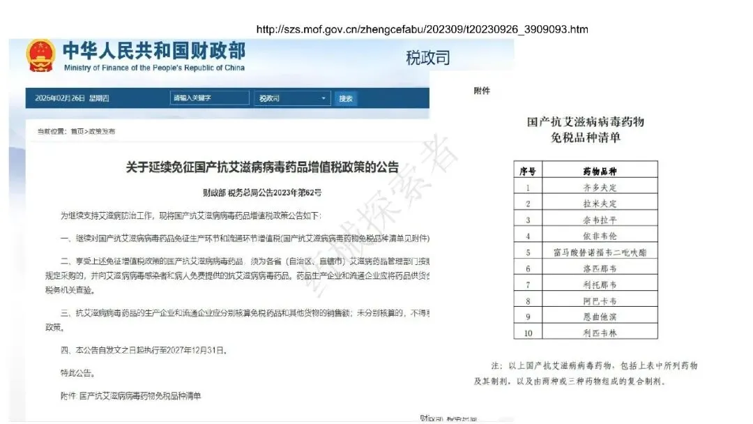 - 4、抗艾滋病病毒药品继续免征增值税,政策执行至 2027 年底,后续会等国家再出通知。