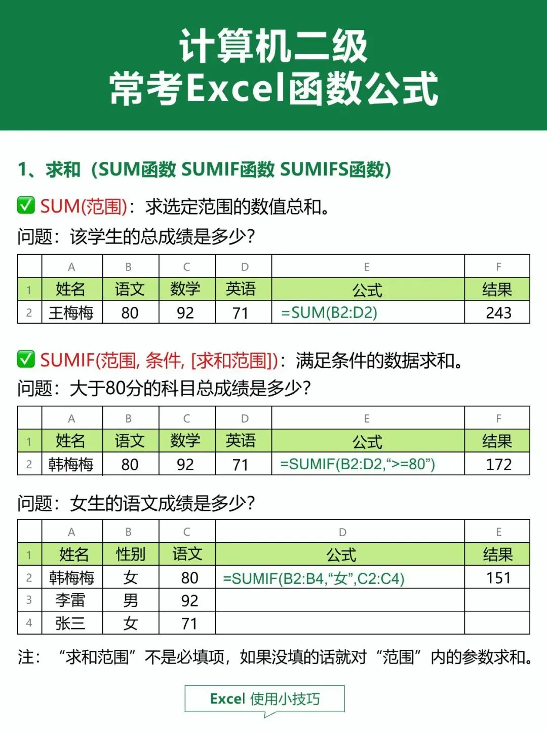 >计算机二级Excel函数公式大总结