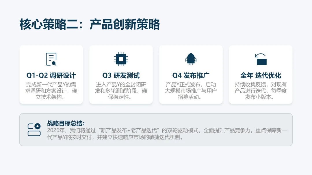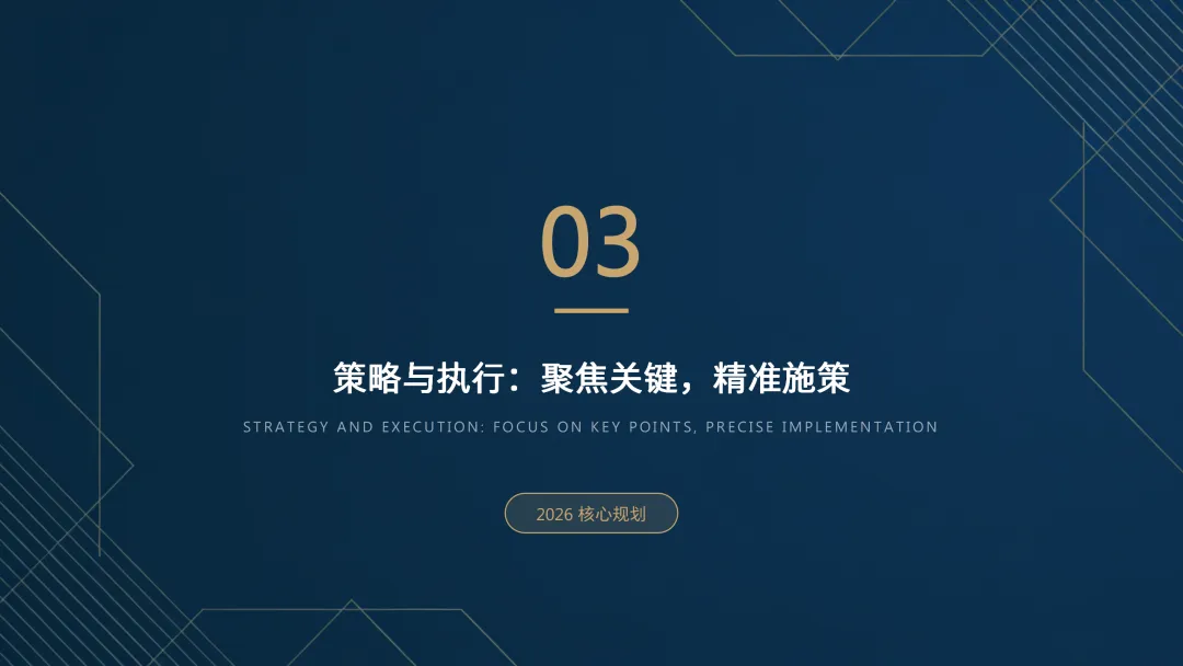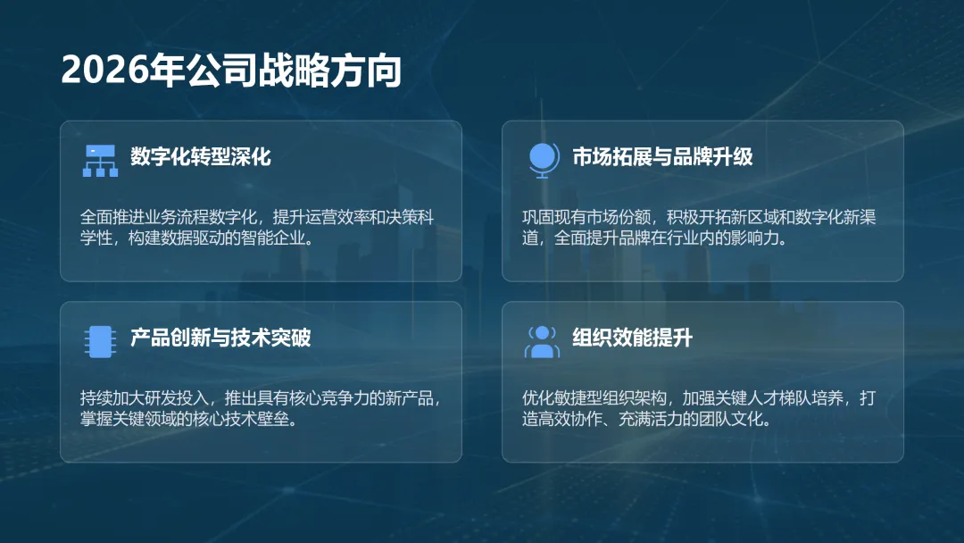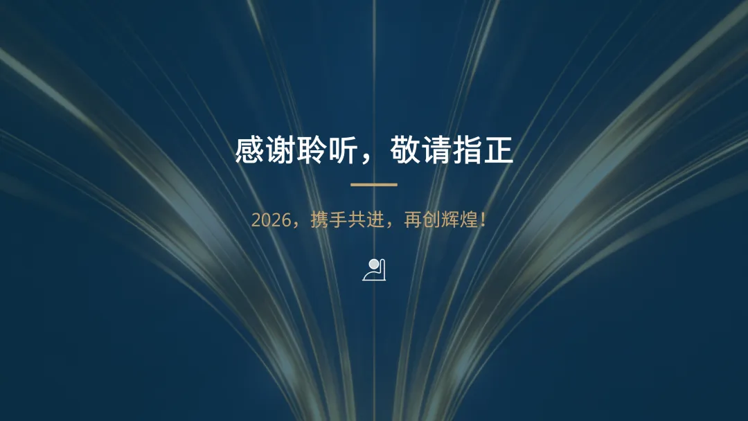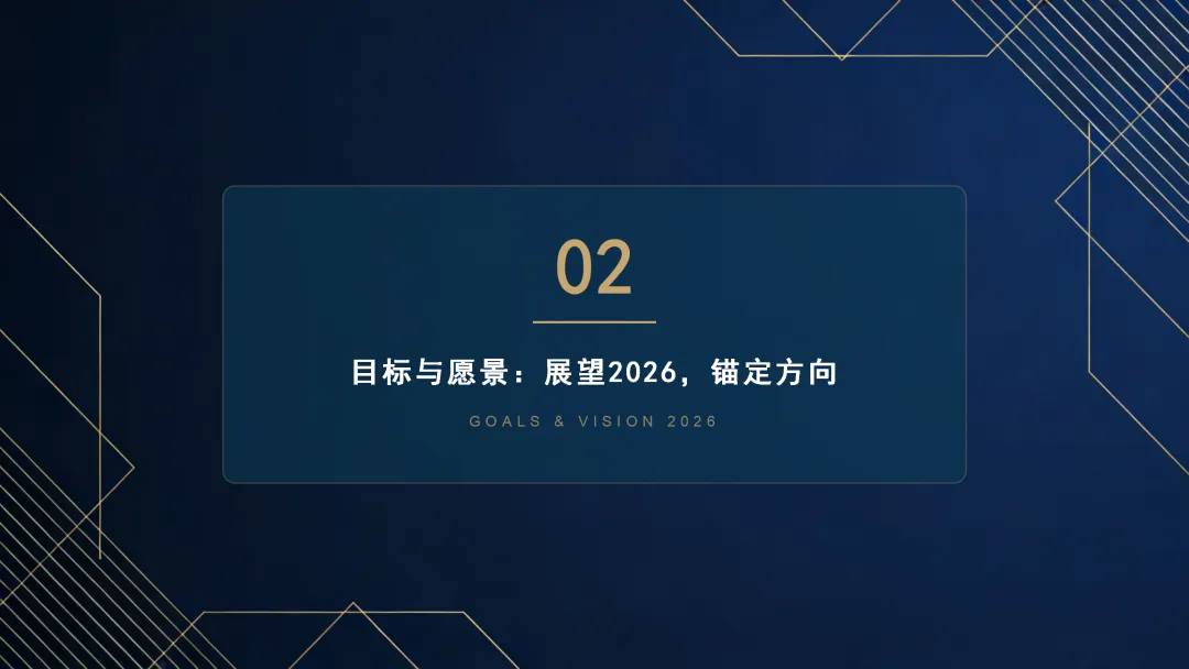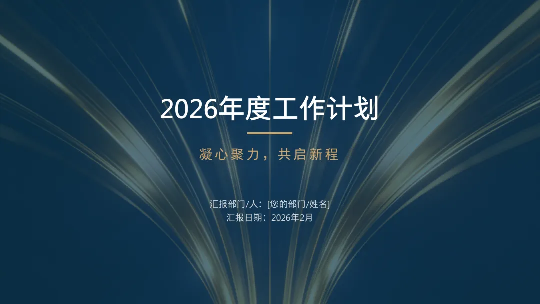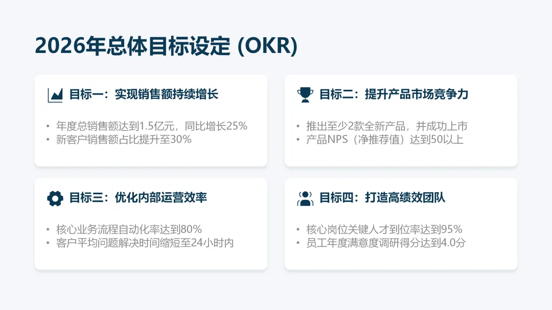 这份《2026 年度工作计划》PPT 旨在全面规划新一年度的工作方向与执行路径。报告首先回顾了 2025 年的工作成果,在销售额、市场份额等关键指标上均超额完成目标,并复盘了核心项目的成功经验与存在的问题。基于此,PPT 明确了 2026 年 “数字化转型深化、市场拓展与品牌升级、产品创新与技术突破、组织效能提升” 四大战略方向,并通过 OKR 框架设定了 1.5 亿元销售额等总体目标,将其层层分解至部门与个人。为实现目标,PPT 详细阐述了线上线下融合的市场拓展策略、以新产品 Y 研发为核心的产品创新策略,以及流程自动化等运营效率提升策略,并规划了三大年度重点项目。最后,从人力资源招聘与培训、2000 万元财务预算分配及风险评估与应对预案等方面,为计划的顺利实施提供了全面的资源与保障支持,旨在通过精准施策与夯实基础,确保 2026 年各项工作目标的圆满达成。