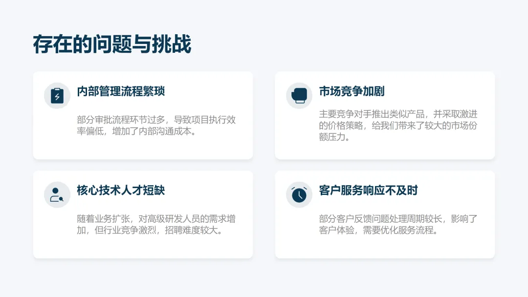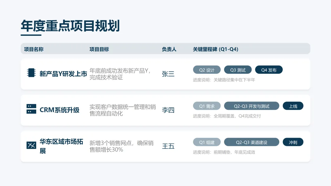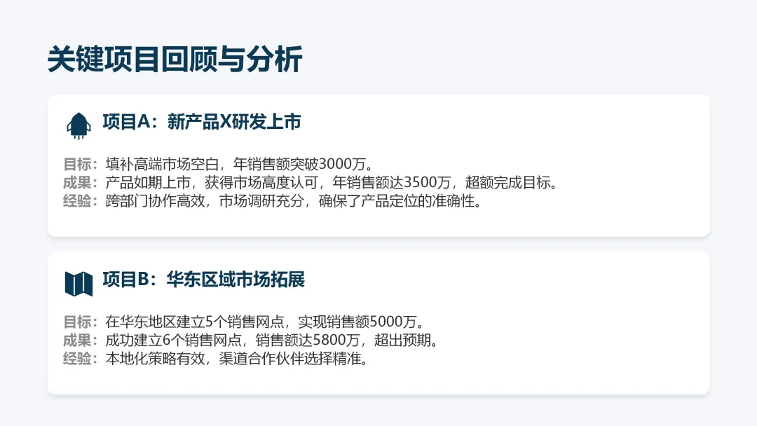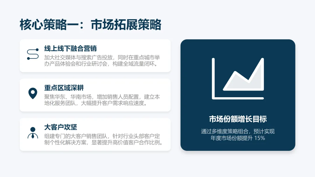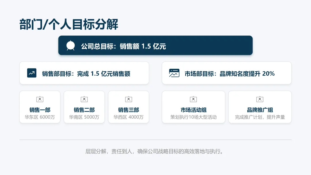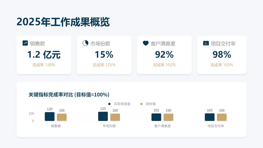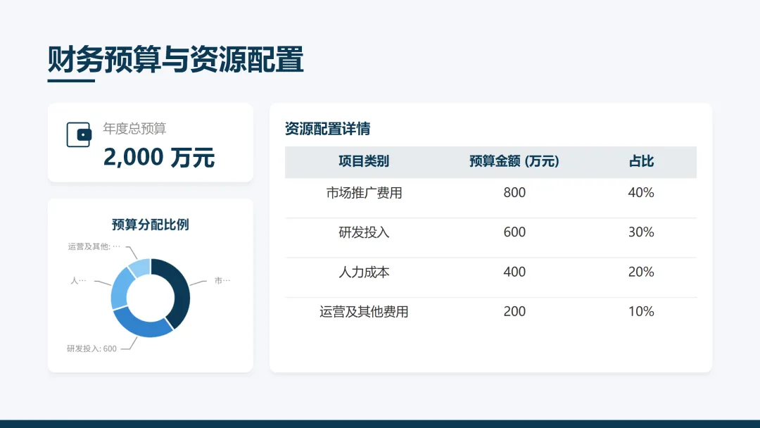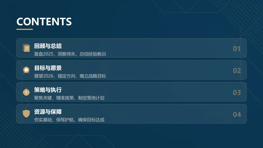 这份《2026 年度工作计划》PPT 旨在全面规划新一年度的工作方向与执行路径。报告首先回顾了 2025 年的工作成果,在销售额、市场份额等关键指标上均超额完成目标,并复盘了核心项目的成功经验与存在的问题。基于此,PPT 明确了 2026 年 “数字化转型深化、市场拓展与品牌升级、产品创新与技术突破、组织效能提升” 四大战略方向,并通过 OKR 框架设定了 1.5 亿元销售额等总体目标,将其层层分解至部门与个人。为实现目标,PPT 详细阐述了线上线下融合的市场拓展策略、以新产品 Y 研发为核心的产品创新策略,以及流程自动化等运营效率提升策略,并规划了三大年度重点项目。最后,从人力资源招聘与培训、2000 万元财务预算分配及风险评估与应对预案等方面,为计划的顺利实施提供了全面的资源与保障支持,旨在通过精准施策与夯实基础,确保 2026 年各项工作目标的圆满达成。