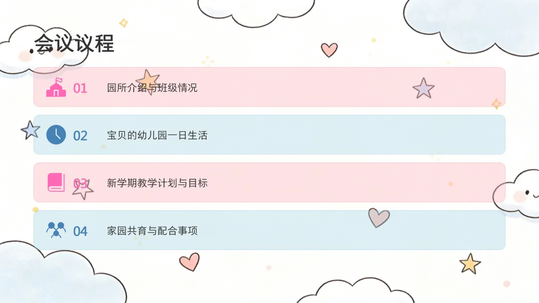 已为您精心制作完成一份 20 页的《幼儿园新学期家长会 PPT》,整体采用活泼可爱的卡通手绘风格,内容涵盖了园所介绍、幼儿一日生活、新学期教学计划以及家园共育等核心板块,并为每一页都配备了详细的演讲稿,方便您直接使用。希望这份 PPT 能帮助您顺利开展新学期的家长会工作!