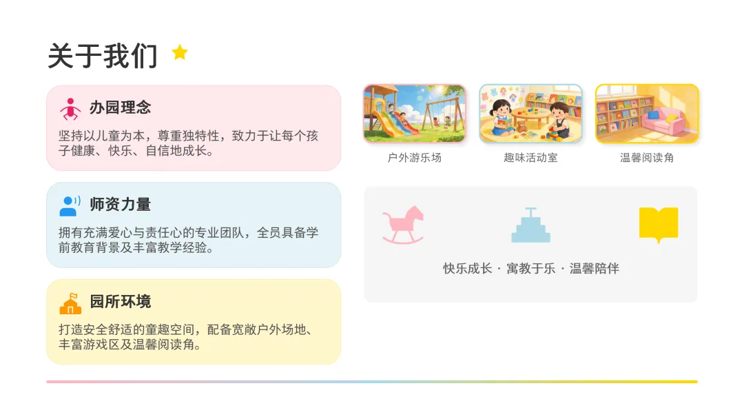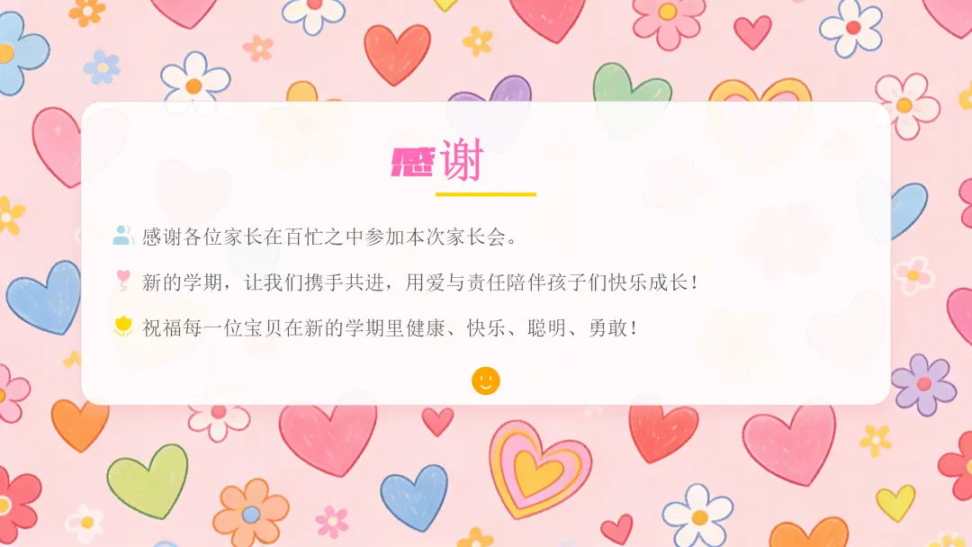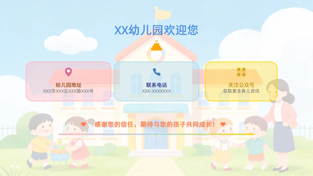 这份《幼儿园新学期家长会 PPT》专为幼儿园开学季设计,整体采用活泼可爱的卡通手绘风格,色彩明快、童趣十足,旨在为家长营造温馨、愉悦的交流氛围。PPT 共 20 页,结构清晰,内容详实,从园所介绍到家园共育,全方位展示了幼儿园的工作与规划。