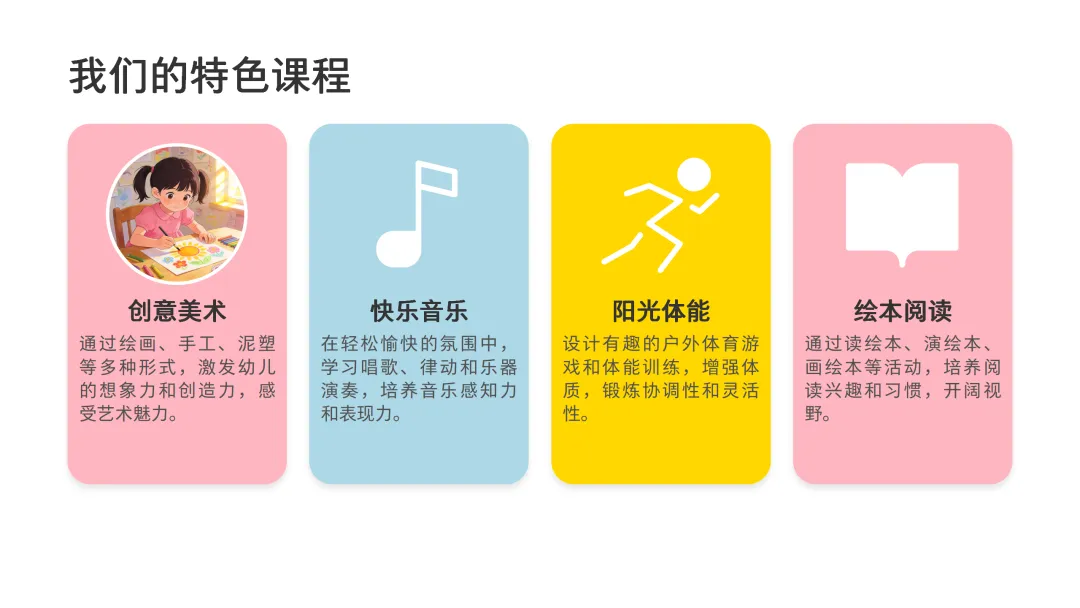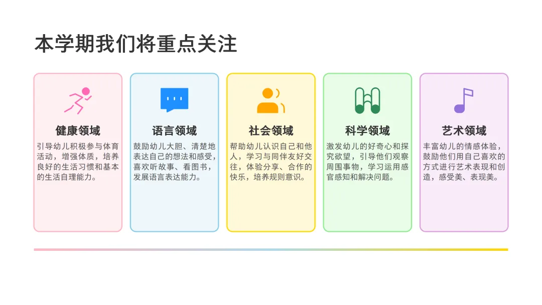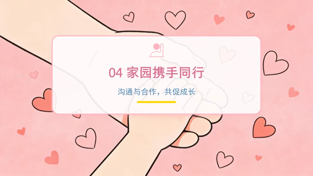内容上,PPT 首先通过 “我们的幼儿园” 章节,介绍了办园理念、师资力量与温馨的园所环境,让家长对幼儿园建立初步信任。接着,“宝贝的一天” 以时间轴形式详细展示了幼儿在园的一日生活流程与自理能力培养,帮助家长直观了解孩子的在园状态。核心部分 “新学期新计划” 则从健康、语言、社会、科学、艺术五大领域阐述了教学目标,并介绍了创意美术、快乐音乐等特色课程,展现了全面的教学体系。最后,“家园携手同行” 明确了家园沟通的多种方式与家长配合事项,强调了安全第一的原则,并解答了家长常见问题,为高效沟通奠定基础。
