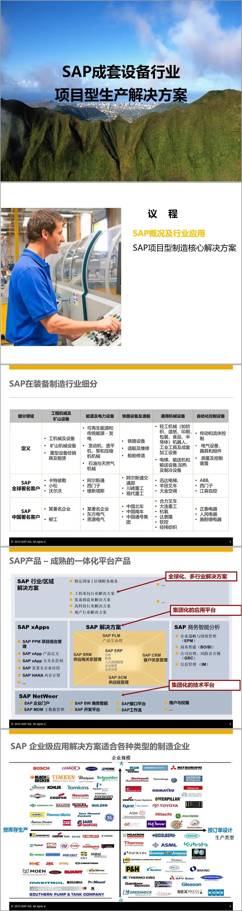 资料开篇首先介绍了SAP在全球及中国装备制造行业的广泛应用,涵盖了工程机械、能源电力设备、铁路造船、通用机械及自动化控制设备等多个细分领域,并列举了如卡特彼勒、阿尔斯通、ABB、正泰电器等国内外知名客户案例,彰显了SAP解决方案的成熟性与普适性。SAP提供的是一套成熟的一体化平台产品,能够灵活支持不同业务模式和管理特点的制造企业。