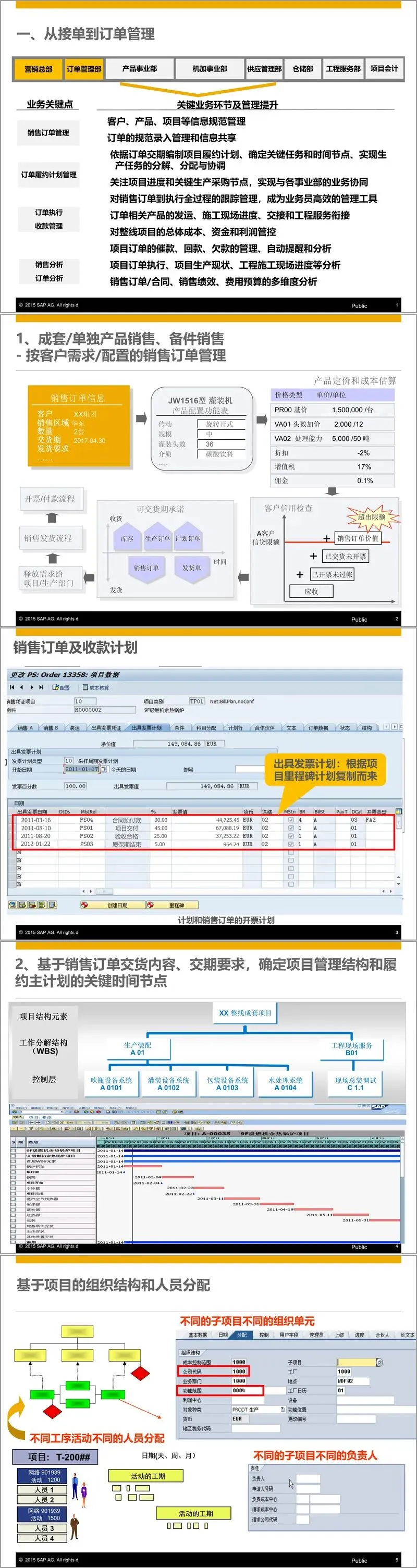 解决方案的核心是建立以项目管理为核心的协同管理体系。文件详细描述了如何通过SAP系统实现整线订单的履约管理,将项目作为贯穿始终的主线,连接营销总部、订单管理部、各产品事业部、机加事业部、供应管理部、仓储部、工程服务部及项目会计等多个部门,实现信息流、物流、资金流的“三流合一”。具体而言,从销售订单开始,系统便对客户、产品、项目等信息进行规范管理,并依据订单交期编制项目履约计划,明确关键任务和时间节点,实现生产任务的分解、分配与协同。系统支持对销售订单执行全过程的跟踪,包括订单发运、发票管理、客户信用评估及回款分析,为管理决策提供支持。