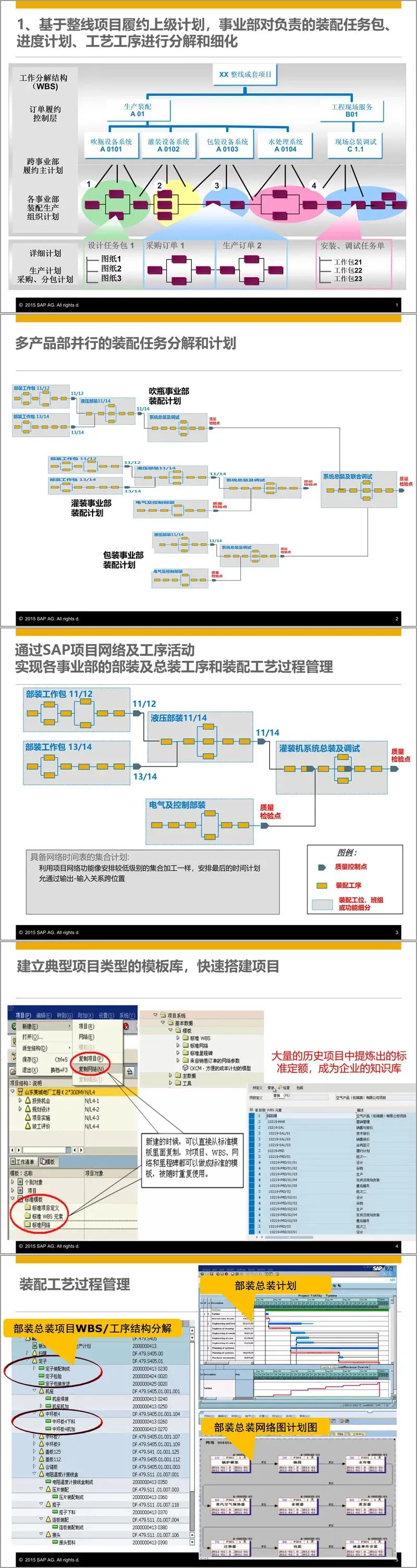 在项目执行层面,SAP解决方案支持全方位的项目管理,涵盖项目结构与信息、立项与状态、计划与调度、采购与库存、配套生产、设备与资源、文档管理以及成本与预算等关键要素。系统能够基于销售订单的交货内容和交期要求,确立项目管理结构和履约主计划的关键时间节点。通过项目网络及工序活动,实现各事业部的部装及总装工序和装配工艺过程管理。企业可以建立典型项目类型的模板库,快速搭建新项目,并将历史项目中提炼的标准定额转化为企业的知识库,实现经验的沉淀与复用。