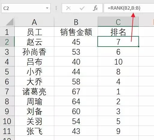 输入公式为:=RANK(B2,B:B)