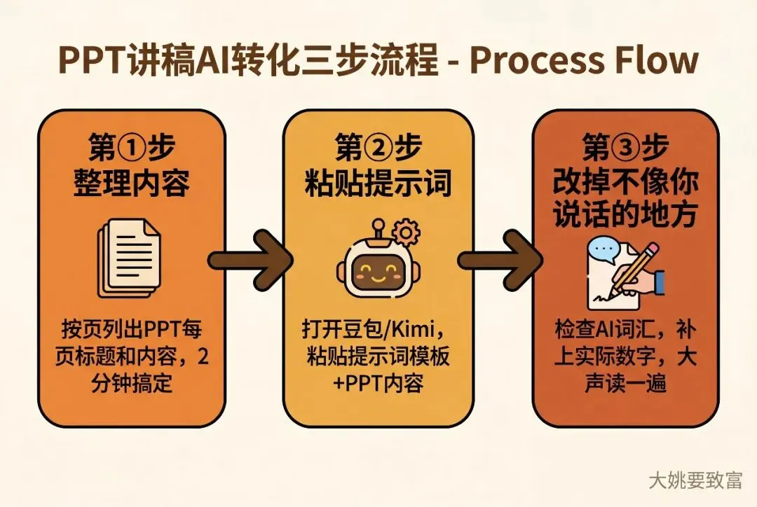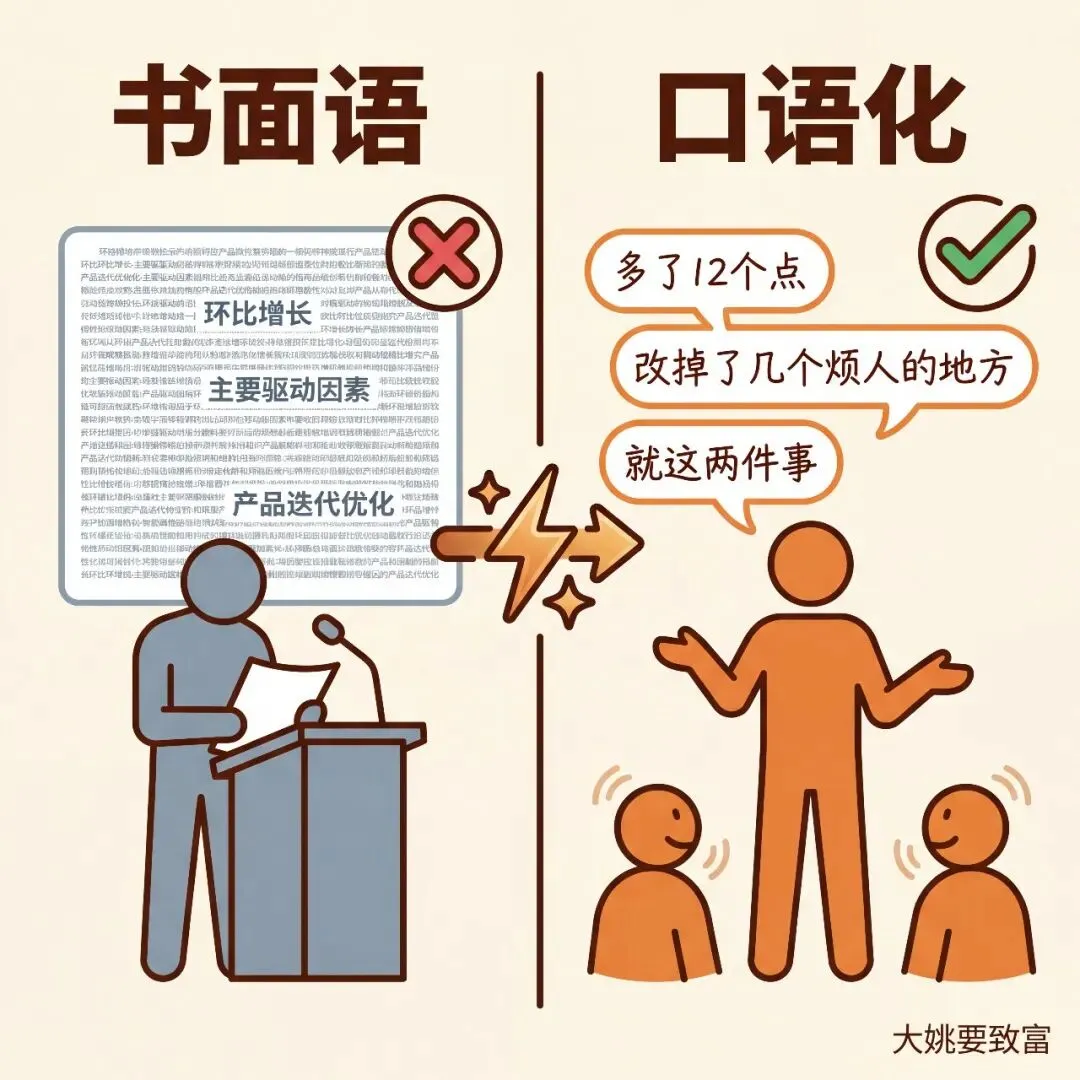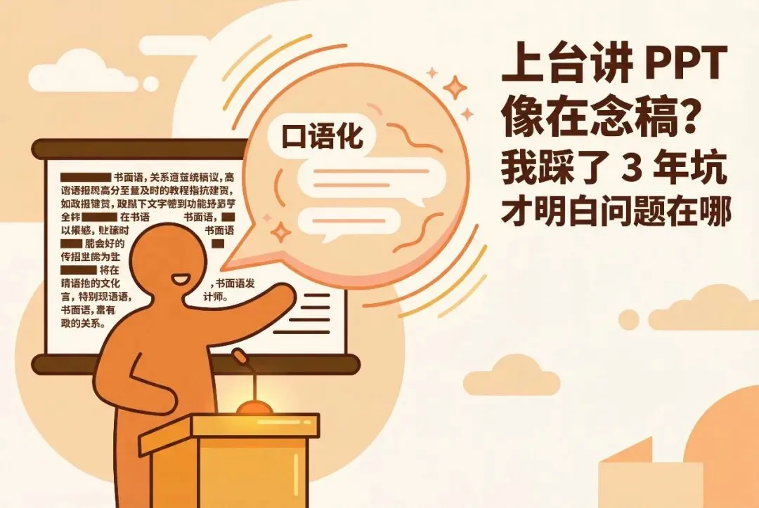 这就是"照本宣科"的根本原因。不是我临场发挥差,是我根本没有把 PPT 文字转成说话用的语言。