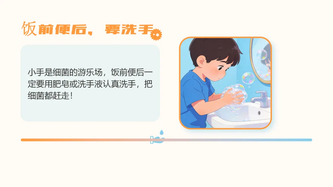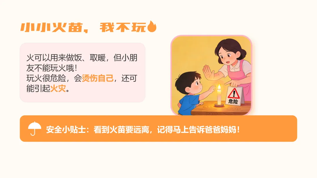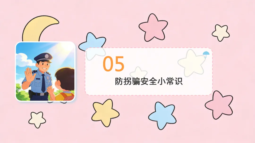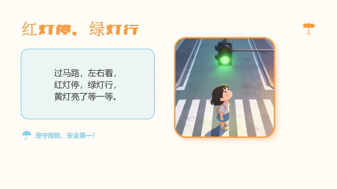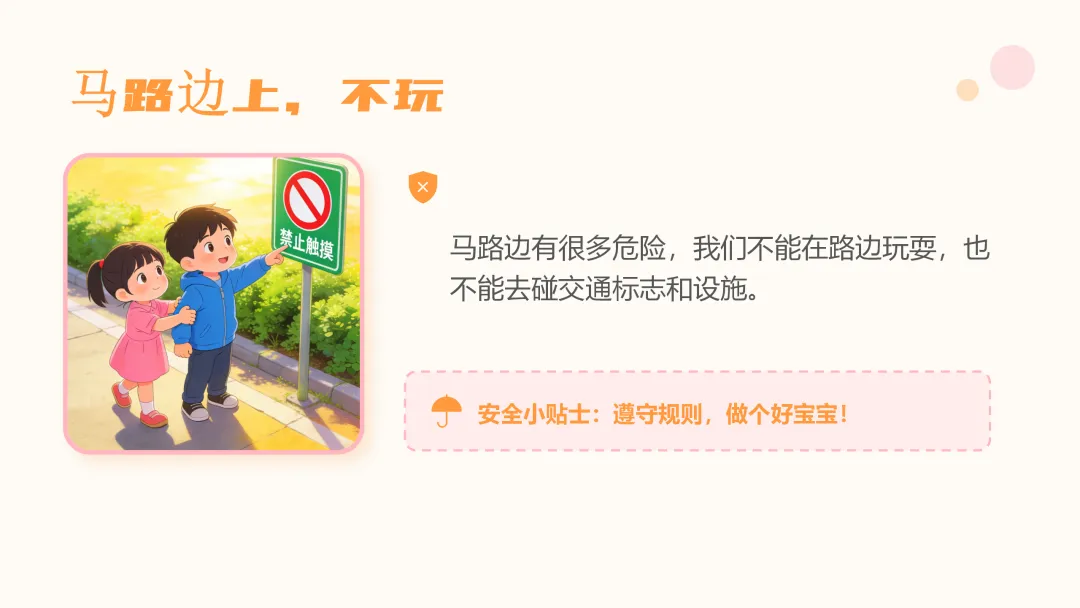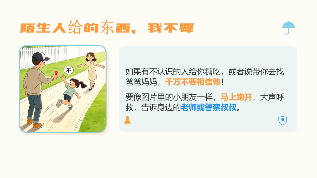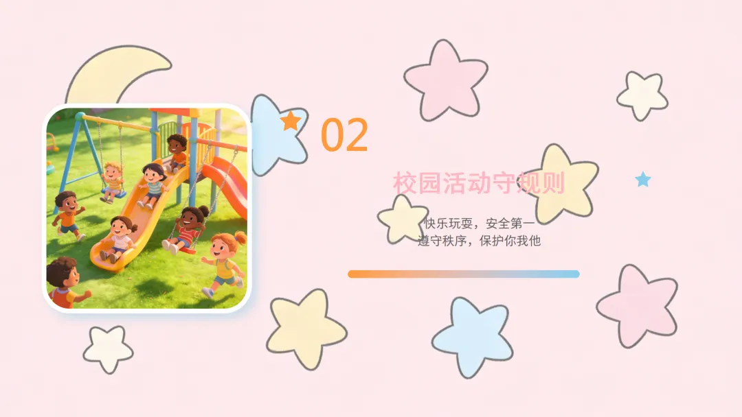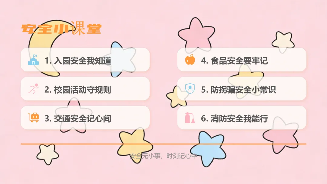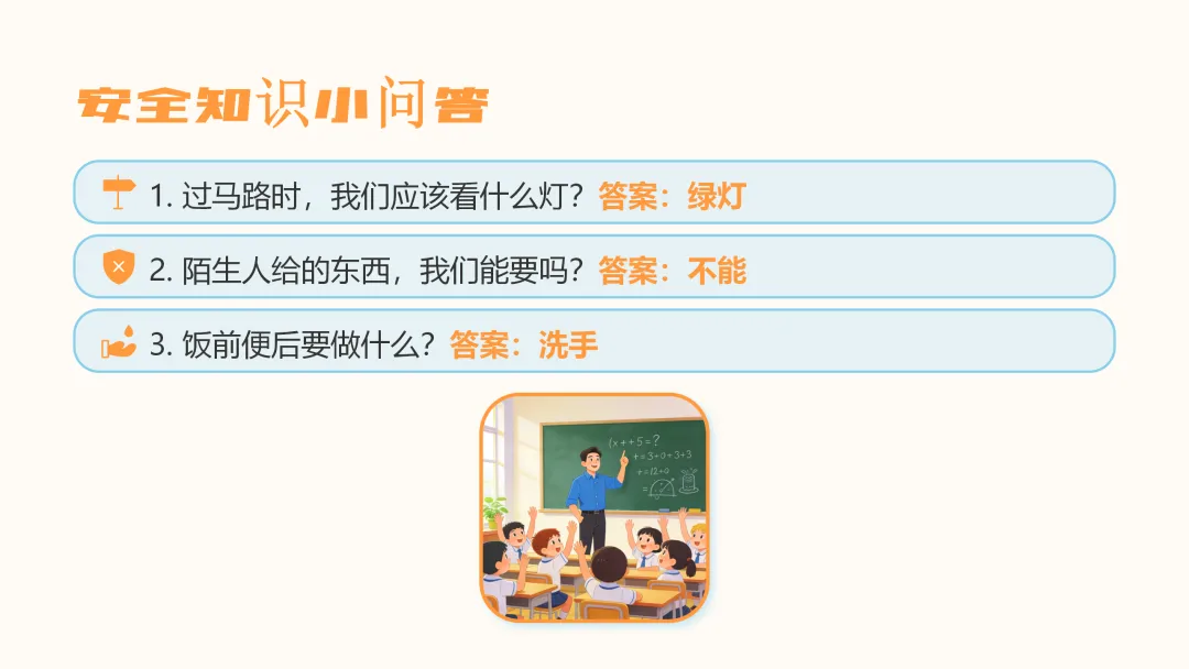 同时,重点融入防拐骗安全和消防安全知识,通过趣味问答、卡通场景模拟等形式,帮助幼儿记住求助方式、掌握基本逃生技巧。整体设计穿插卡通插画、简单口诀和互动环节,弱化生硬说教,让幼儿在轻松愉快的氛围中理解安全意义、掌握安全技能,帮助幼儿快速适应校园生活,树立自我保护意识,也为幼儿园开学安全教学提供清晰、实用的演示工具,筑牢幼儿校园安全第一道防线。