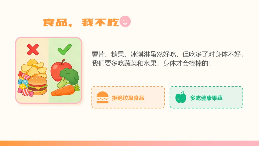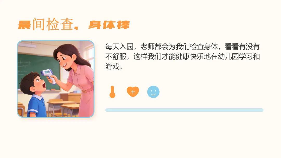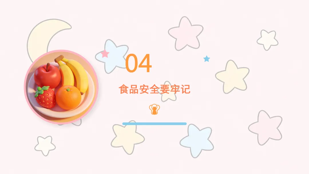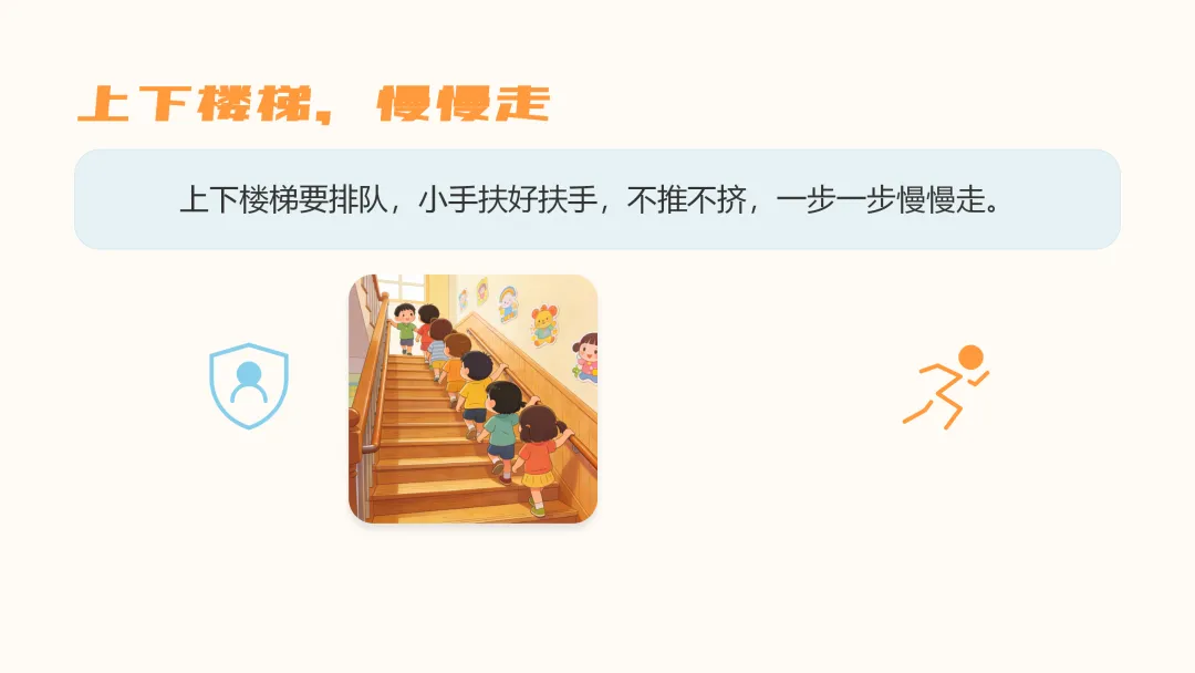 PPT围绕幼儿日常校园生活场景,系统涵盖六大核心安全主题,内容通俗易懂、贴近幼儿生活:入园安全明确入园流程、物品携带禁忌,引导幼儿主动配合晨检;校园活动安全讲解上下楼梯、游戏玩耍、户外活动的注意事项,规避磕碰、摔倒等风险;交通安全通过简单易懂的场景演示,教会幼儿识别红绿灯、不乱跑乱闯;食品安全引导幼儿不捡食异物、不食用过期食物,养成良好饮食习惯。