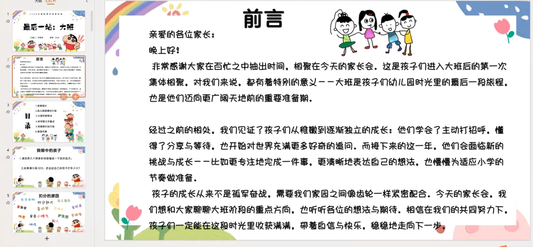 非常感谢大家在百忙之中抽出时间,相聚在今天的家长会。这是孩子们进入大班后的第一次集体相聚,对我们来说,都有着特别的意义——大班是孩子们幼儿园时光里的最后一段旅程,也是他们迈向更广阔天地前的重要准备期。