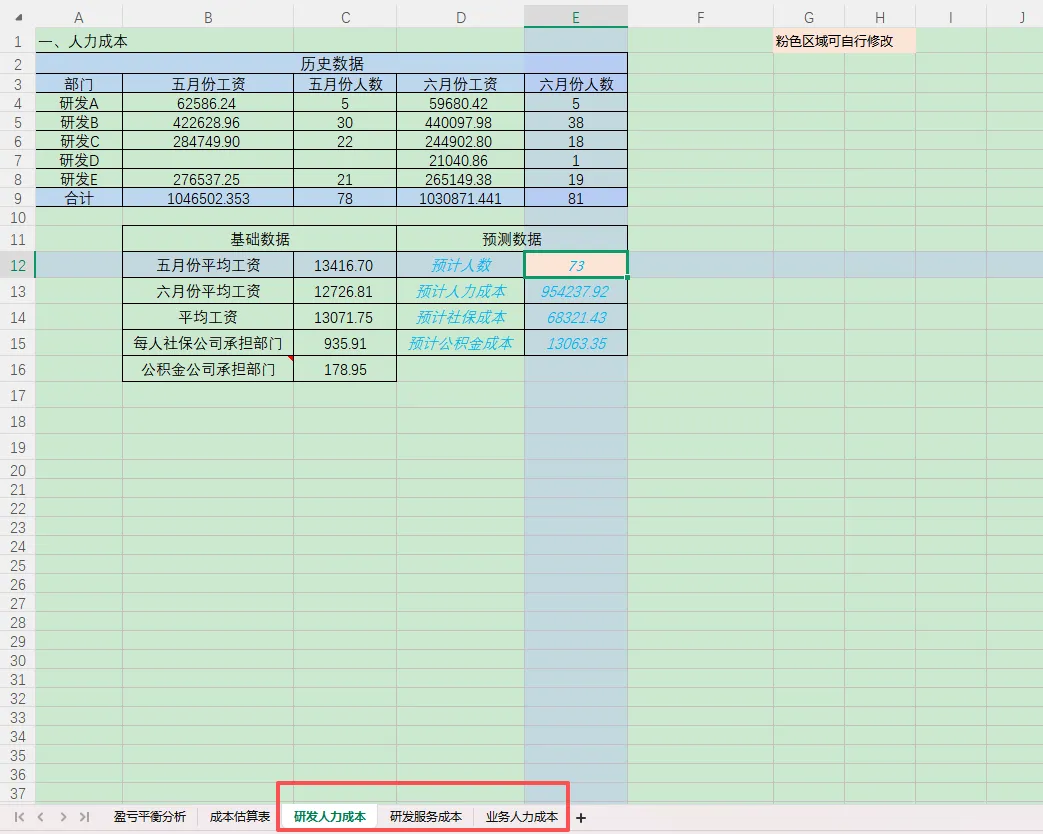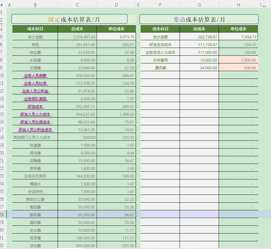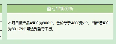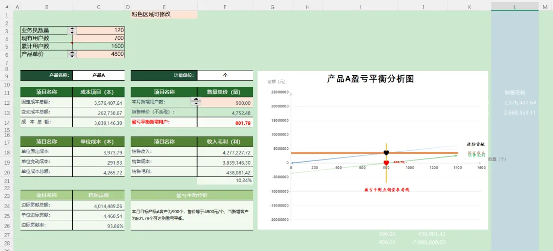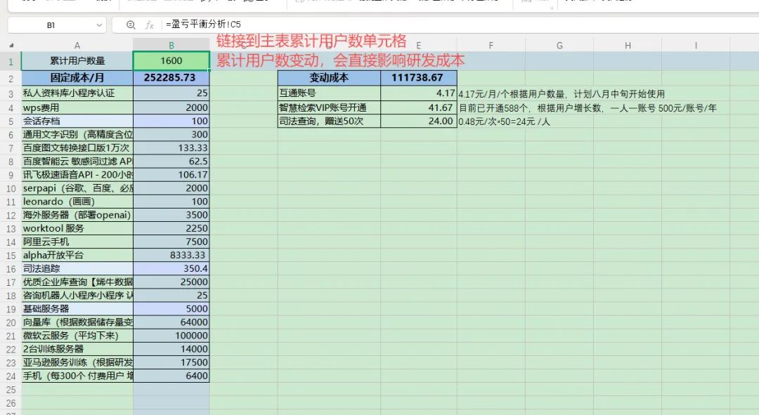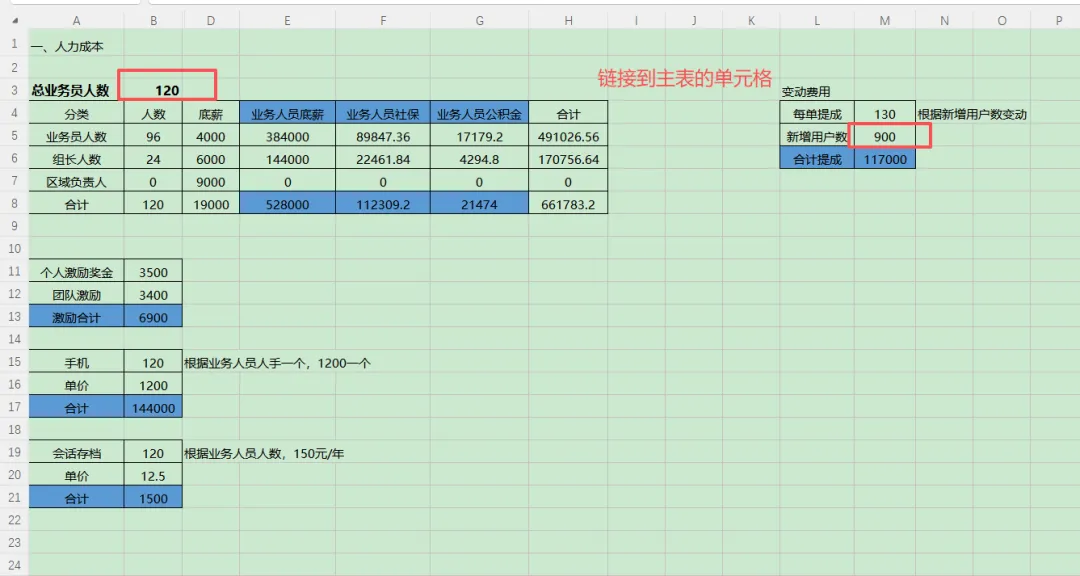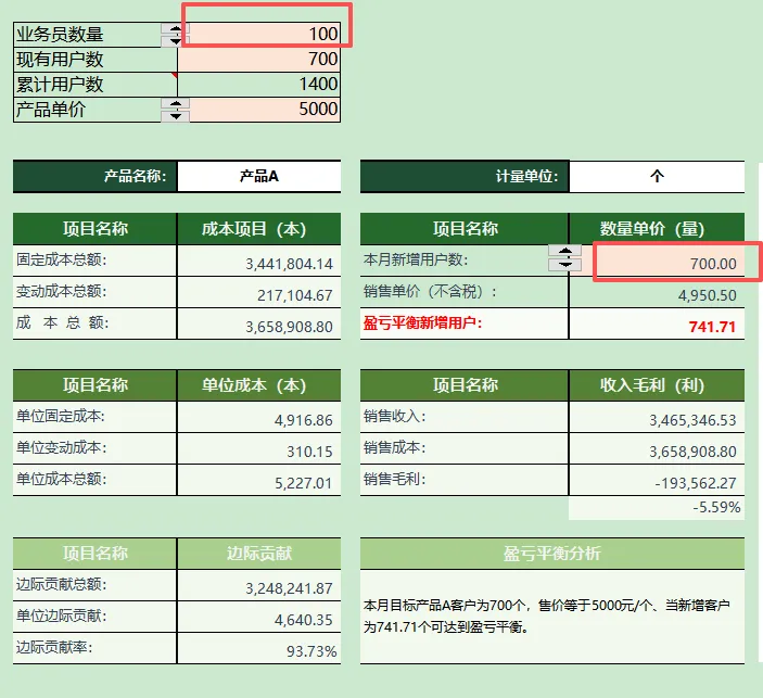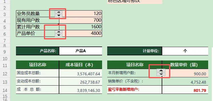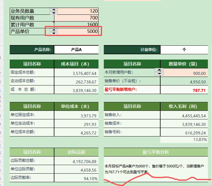 固定成本(不随业务变动而变动的成本):例如房租、水电费、办公费、固定的人力成本等。变动成本(随业务变动而变动的成本):例如业务通讯费、研发使用费等背景:公司现有一个产品A,需要测算一下销售价格与业务员数量及销售数量三者的动态关系。目前有业务员120人(实际),客户700人(实际),产品单价暂定4800常规固定成本有:房租、物业费、水电费、空调费、管理部门人员人力成本、快递费、保洁费、招聘费、宽带费、业务手机购买、桶装水、差旅费、租赁费等,根据公司历史账务分类并取数。常规变动成本有:研发变动成本(服务器使用费用根据客户的数量变化而变化)、业务变动人力成本(提成、奖励等)、外呼费用(主要为电话销售)等,取数需要业务/研发部门配合。特殊成本:业务人员&研发人员底薪、提成、社保等人力成本,需要根据招聘的人员数量进行变动,所以我超链接到其他表格里,比较清晰明了(每个公司业务不同,奖励方式与成本类型也不一样,根据实际情况修改)常以月为单位,例如房租是按照季度缴纳881571元,总成本就写881571/3=293857元,单位成本是/本月新增的用户数。①要测算销售价格与业务员数量及销售数量三者的动态关系,就要把三个参数都加上动态调整按钮(窗体-微调项)②根据盈亏相关知识设置公式,并进行表格之间的连接(你需要具备财务知识)数据出来后,我先是根据历史老板定的目标进行了对比,发现偏差不大,(老板虽然不做数据,但是他是知道大概的成本与营收的,会在给业务部门制定目标时体现)当我把价格调整到5000时候,我售卖760多个即可达到盈亏平衡。当我业务员只剩下100个,下月售卖目标为700个时,我需要达到740个才能盈亏平衡,所以能看出来此时售卖目标制定低了,毛利为负。如果产品已经在售卖了,那么一般定价是不太容易变动了,此模型就能用于业务月度目标的制定以及人员的规划。