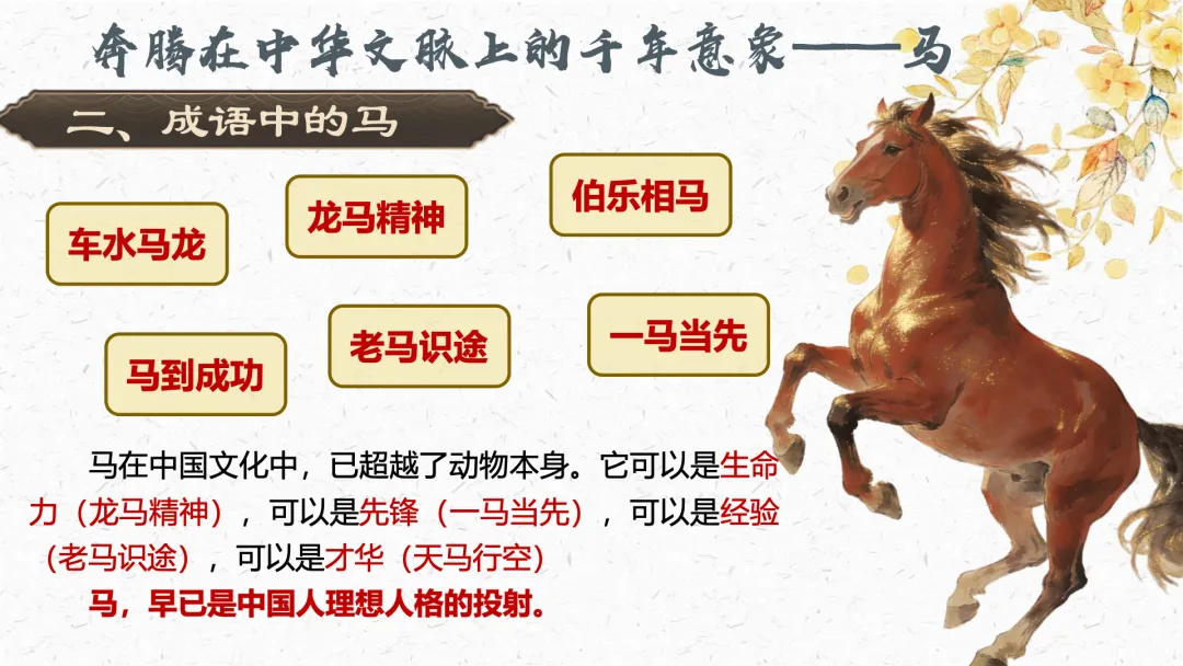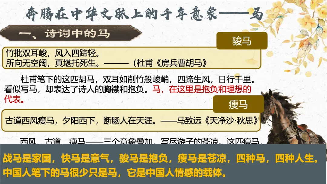 整节课我选取了一个贯穿始终的文化母题——“马”在中国文化中的千年意象。