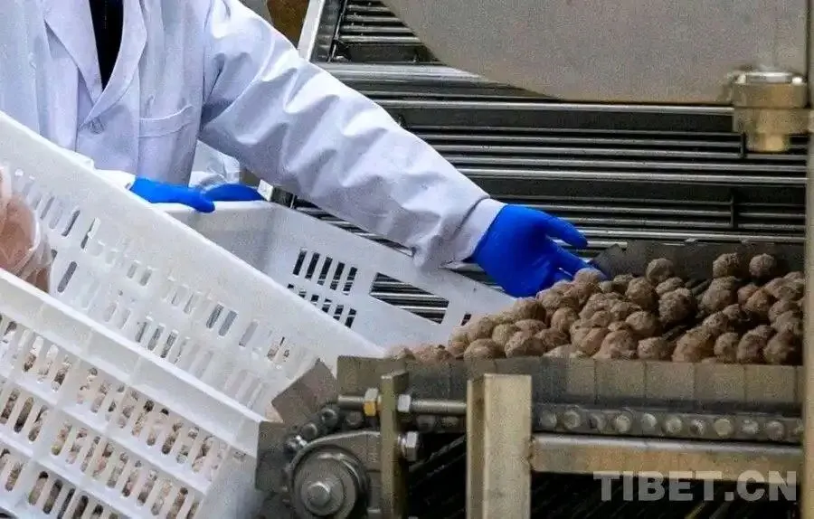 在全长约300米的全自动化生产线上,一块块经过严格检疫的新鲜有机牦牛肉,依次完成去骨、去油、剔筋膜等精细处理流程后,在精准温控下,再经过打浆、定型、熟化和风冷等自动化流程,变身为一颗颗牦牛肉丸。它们在输送带上“列队”行进,犹如跳动的“高原红珍珠”。