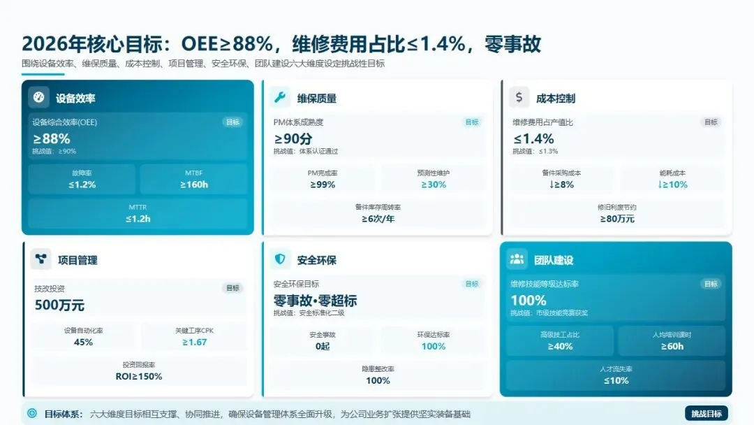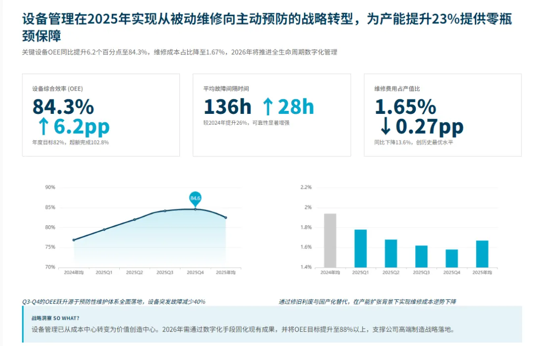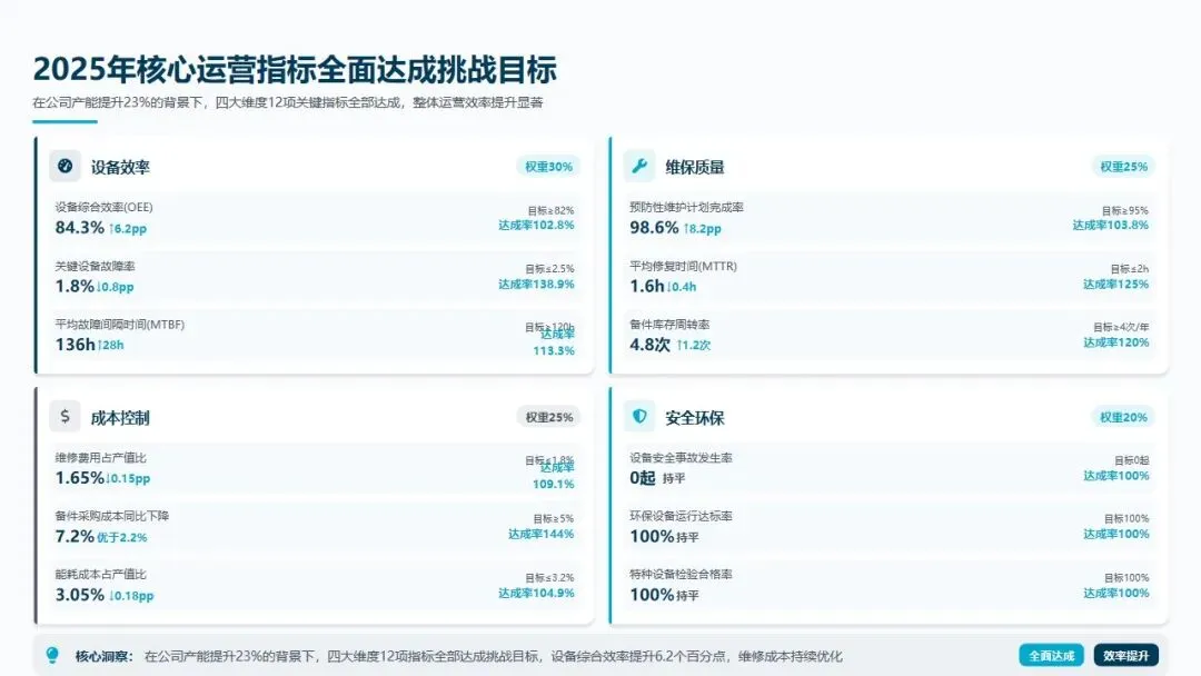 2025年,设备管理部建立"指标牵引-过程管控-闭环改善"的全周期管理机制,围绕设备效率、维保质量、成本控制、安全环保四大维度设定核心指标。在公司产能提升23%的背景下,关键设备指标全面达成挑战目标,整体运营效率提升显著。