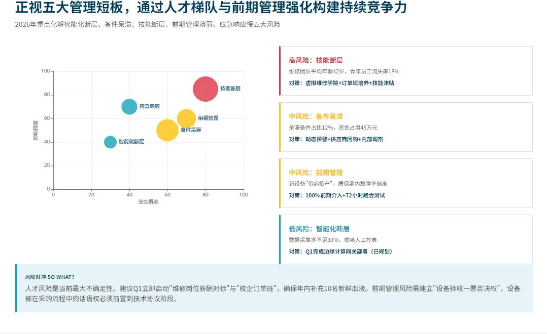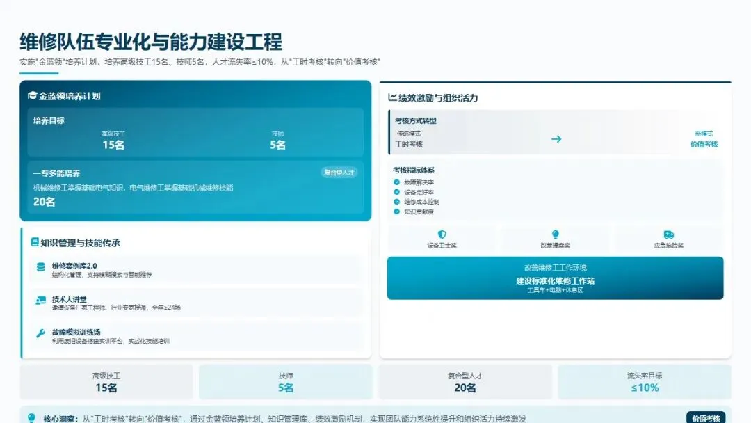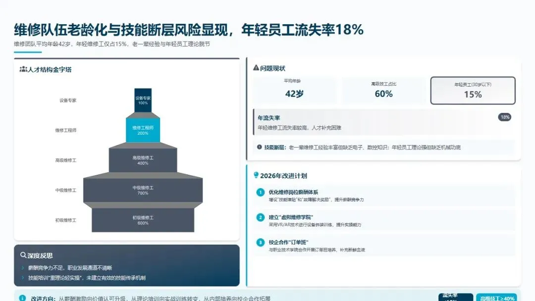 改进计划:2026年优化维修岗位薪酬体系,增设"技能津贴"和"故障解决奖励";建立"虚拟维修学院",采用VR/AR技术进行设备拆装训练;与职业技术学院合作开展"订单班"培养,补充新鲜血液。