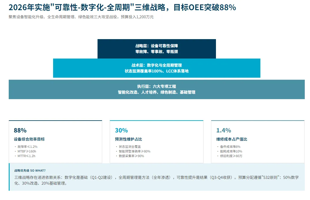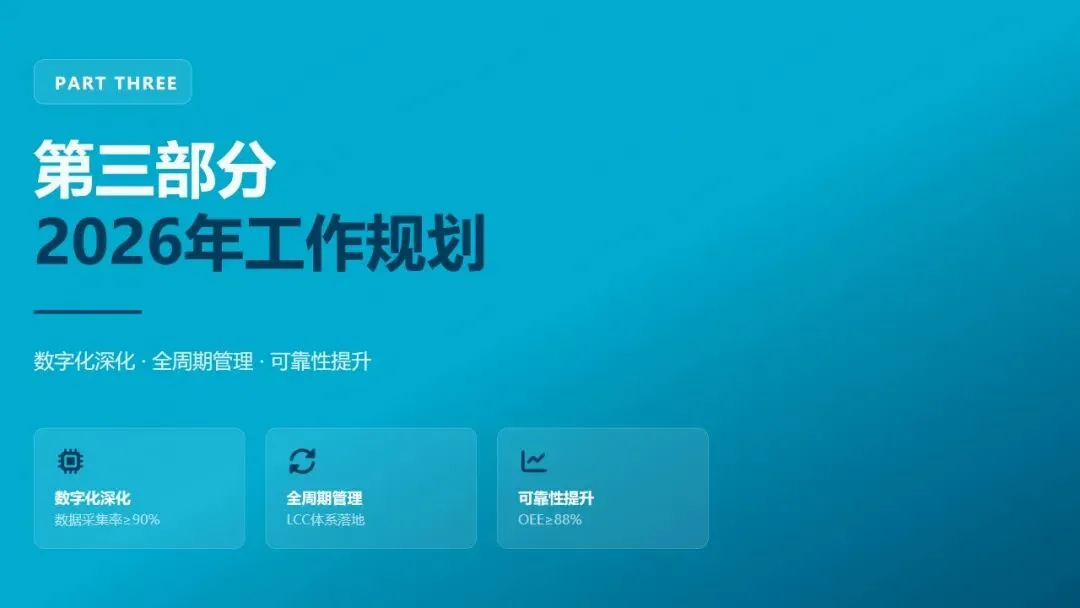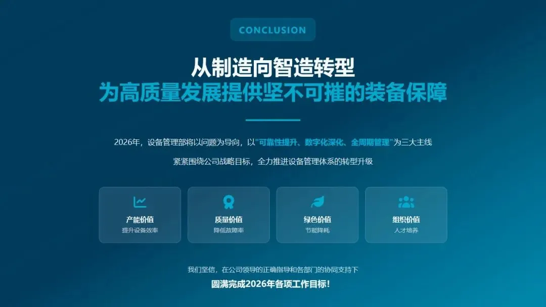 2026年,我们将以问题为导向,以"可靠性提升、数字化深化、全周期管理"为三大主线,紧紧围绕公司战略目标,全力推进设备管理体系的转型升级。我们深知,设备管理不仅是保障生产,更是创造价值——通过提升设备效率创造产能价值,通过降低故障率创造质量价值,通过节能降耗创造绿色价值,通过人才培养创造组织价值。