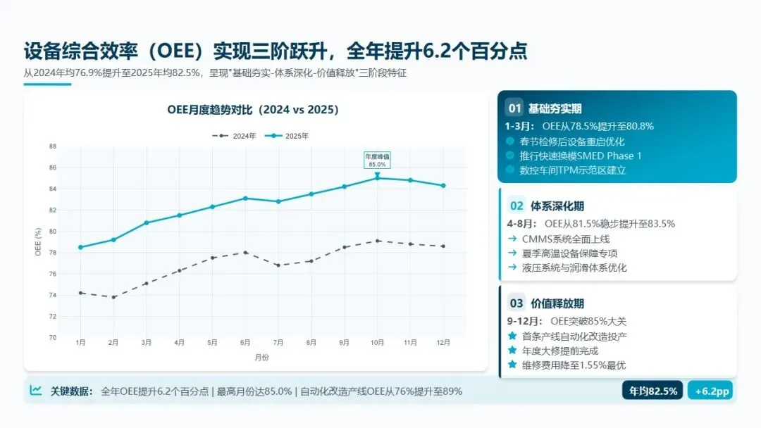 价值量化TPM深化推进带来设备综合效率的实质性提升。全年设备故障停机时间同比减少1,240小时,按小时产值计算,相当于增加有效产出价值约380万元。设备外观完好率从82%提升至96%,客户审核满意度提升12个百分点。
