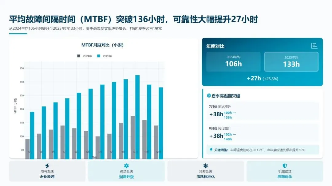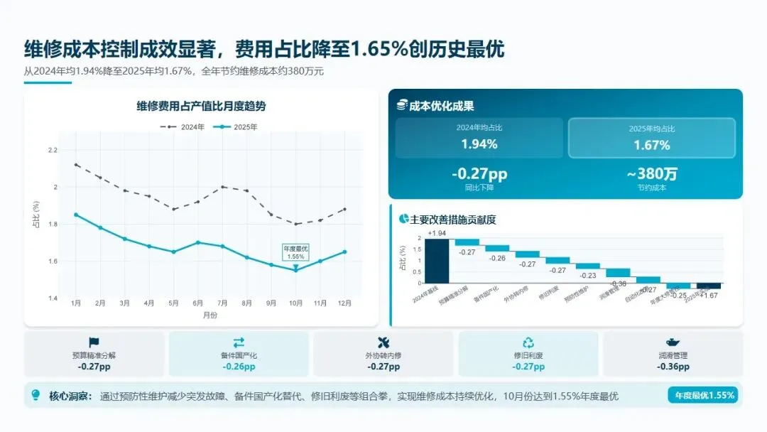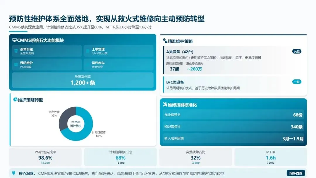 数据成果预防性维护计划完成率达98.6%,较2024年的90.4%提升8.2个百分点。计划性维修占比从2024年的35%提升至2025年的68%,突发故障占比从65%降至32%。平均修复时间(MTTR)从2024年的2.0小时降至1.6小时,降幅20%,主要得益于标准作业和备件前置管理。